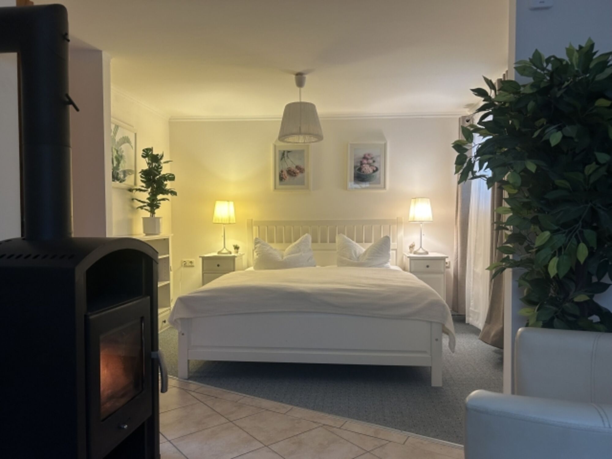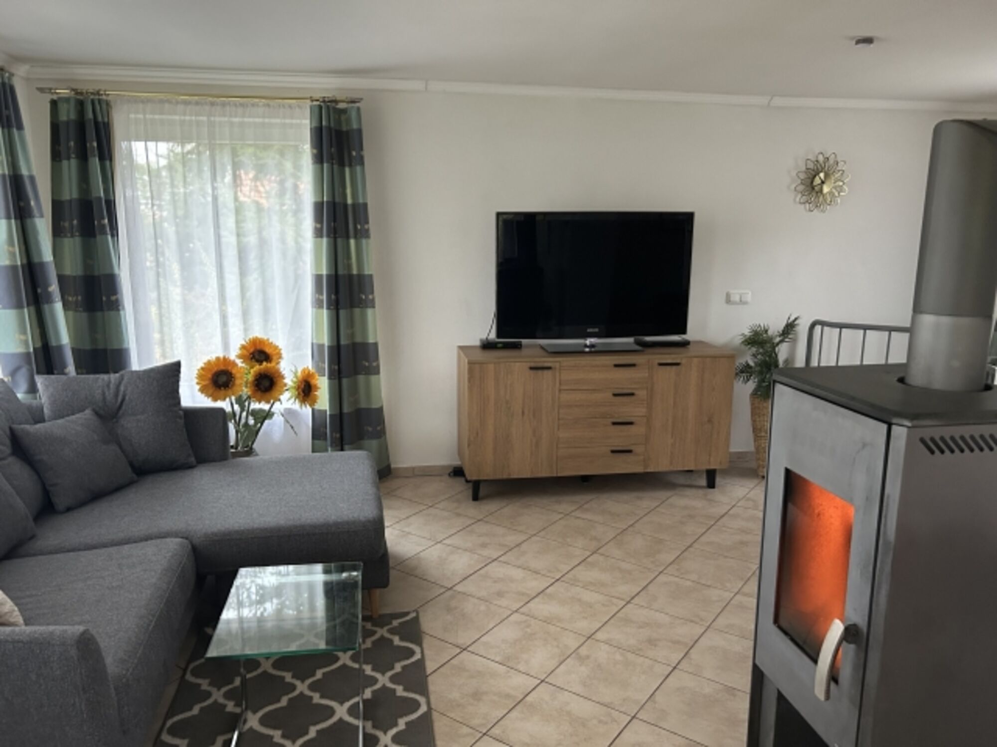 TV-Sat, TV-Flachbildschirm, DVD-Player, DVD bzw. Blu-Ray-Filme, Hi-Fi-Anlage mit Bluetooth, CD´s, Bücher, Kaminofen, Eckcouch, Sessel, Fliegengitter
