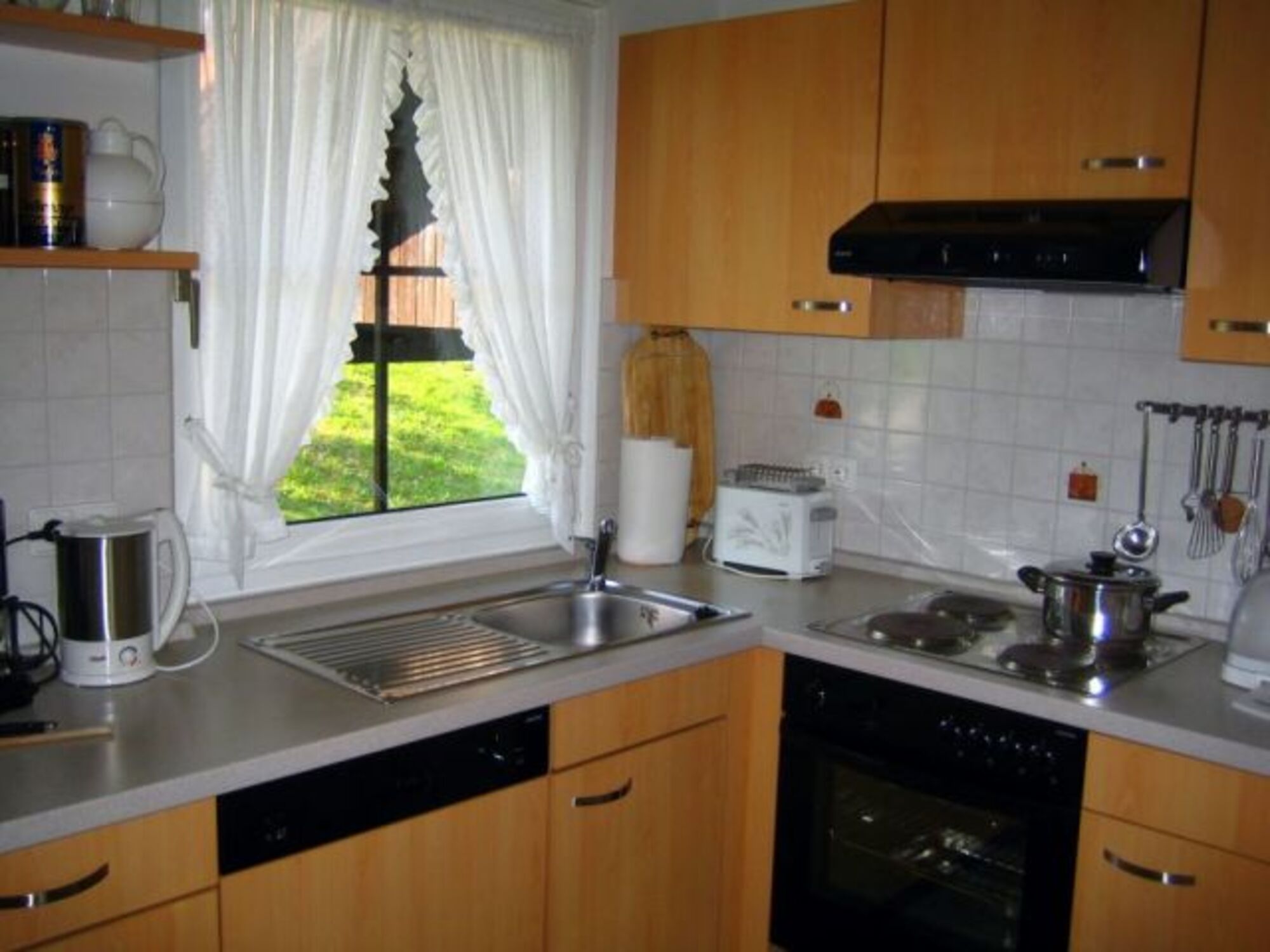 4-Platten Herd, Cerankochfeld, Kühlschrank mit Gefrierfach, Eierkocher, Korkenzieher / Flaschenöffner, Gewürze (Salz, Pfeffer, Zucker), Öl / Essig