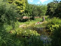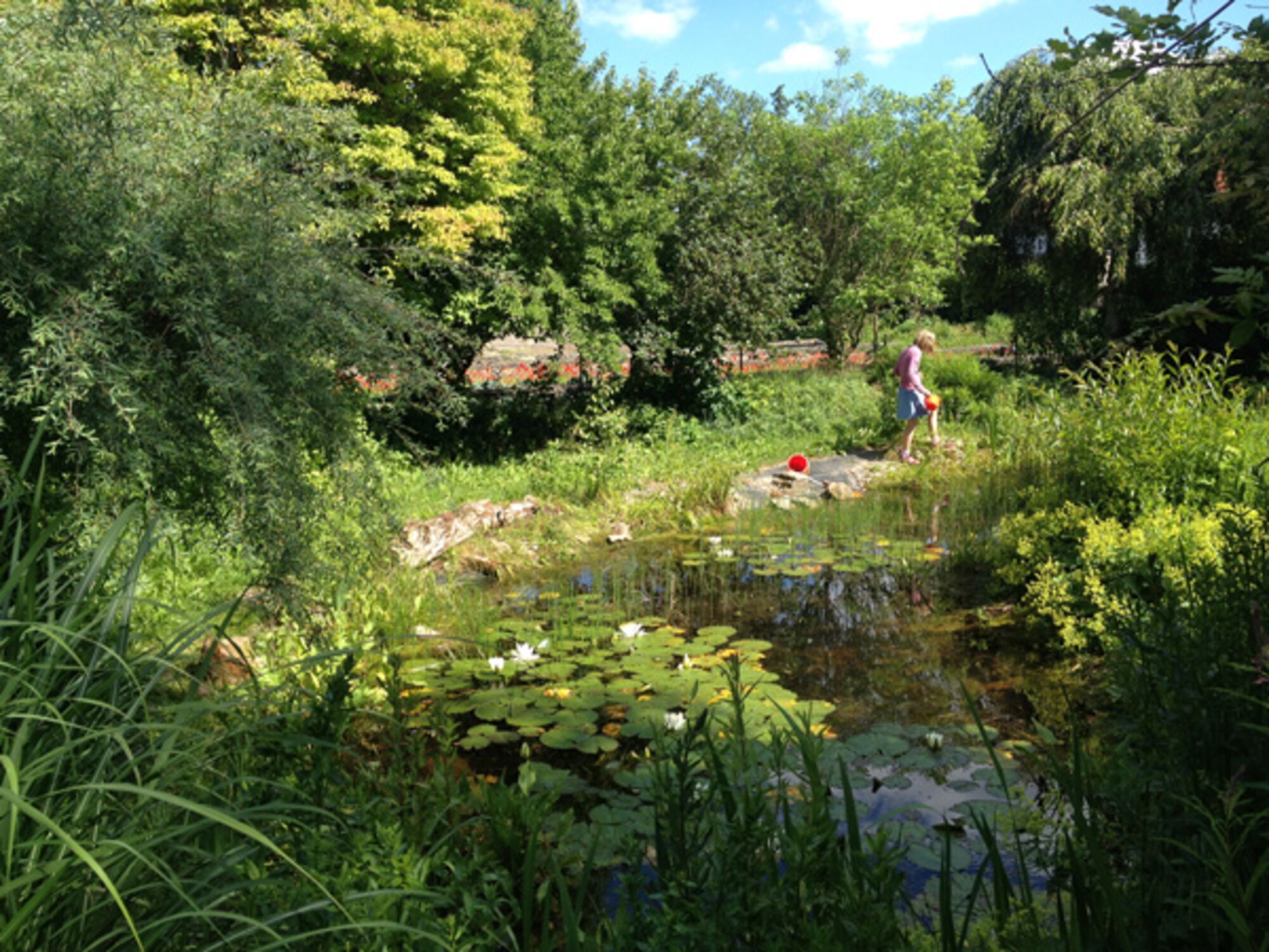 Vollbad mit Badewanne und Waschbecken, 2 separate WCs. Waschmaschine. Garten mit Sandkiste, Naturteich und Gartenmöbeln, Terrasse mit schönem Holzboden, Holz-Kinderspielhaus.