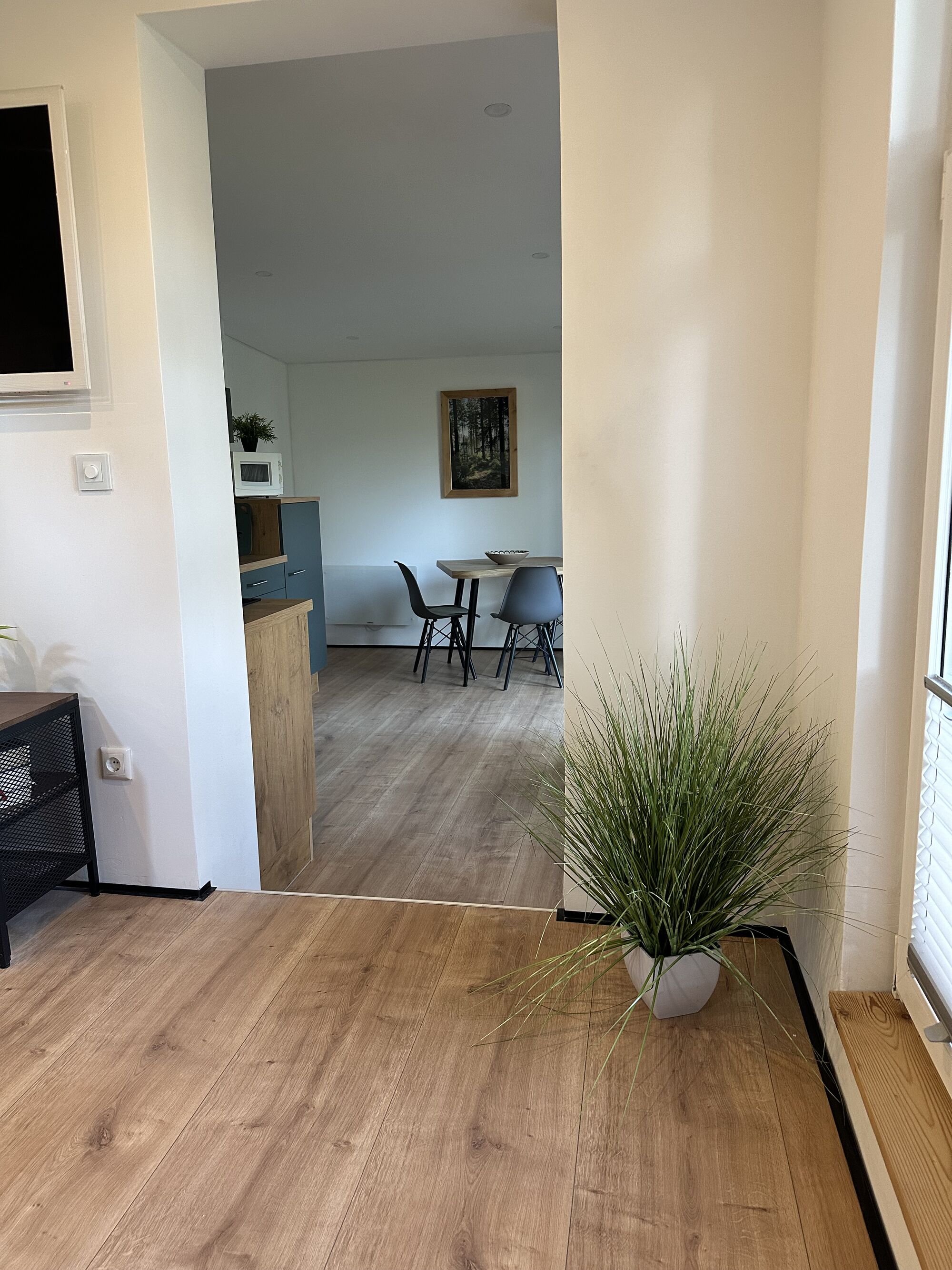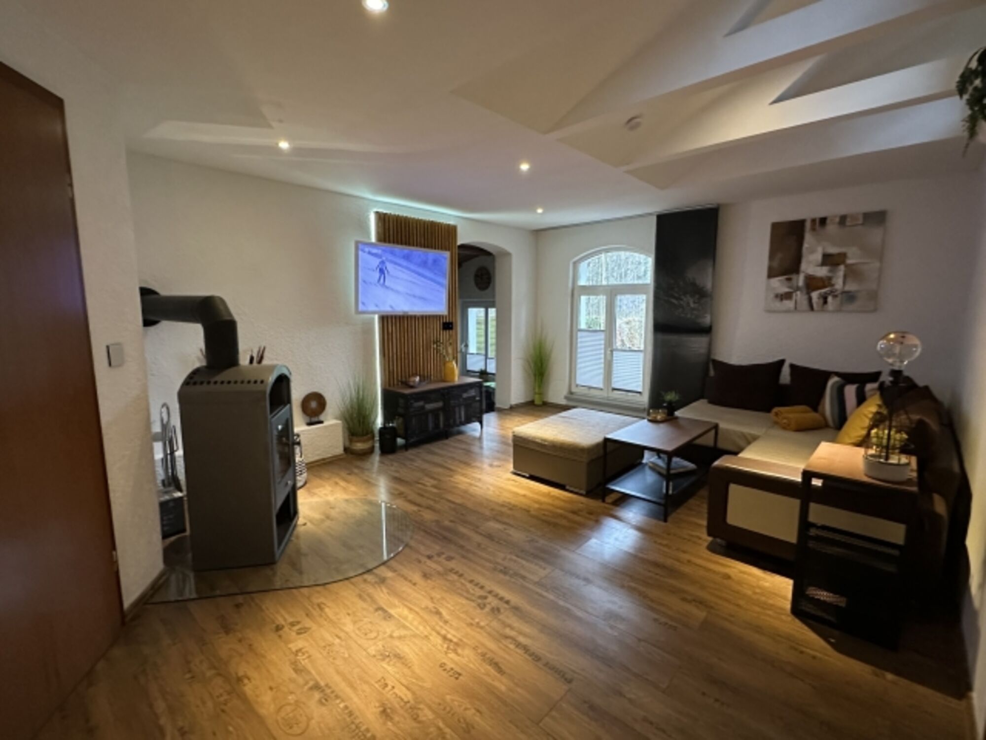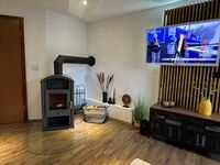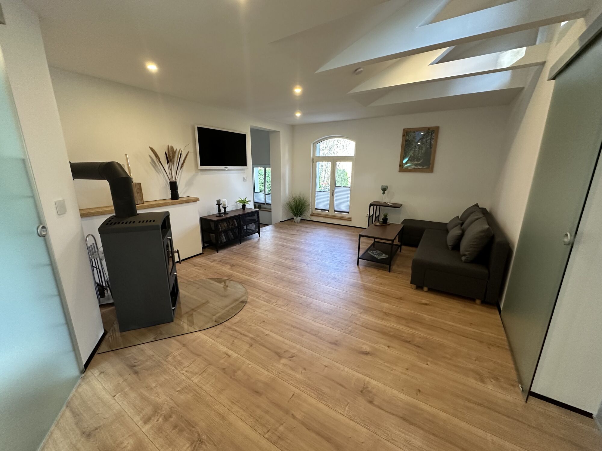 Danach geht's in den Wohnraum. Dieser ist modern gestaltet und der Kaminofen macht dieses Haus auch im Winter besonders gemütlich.