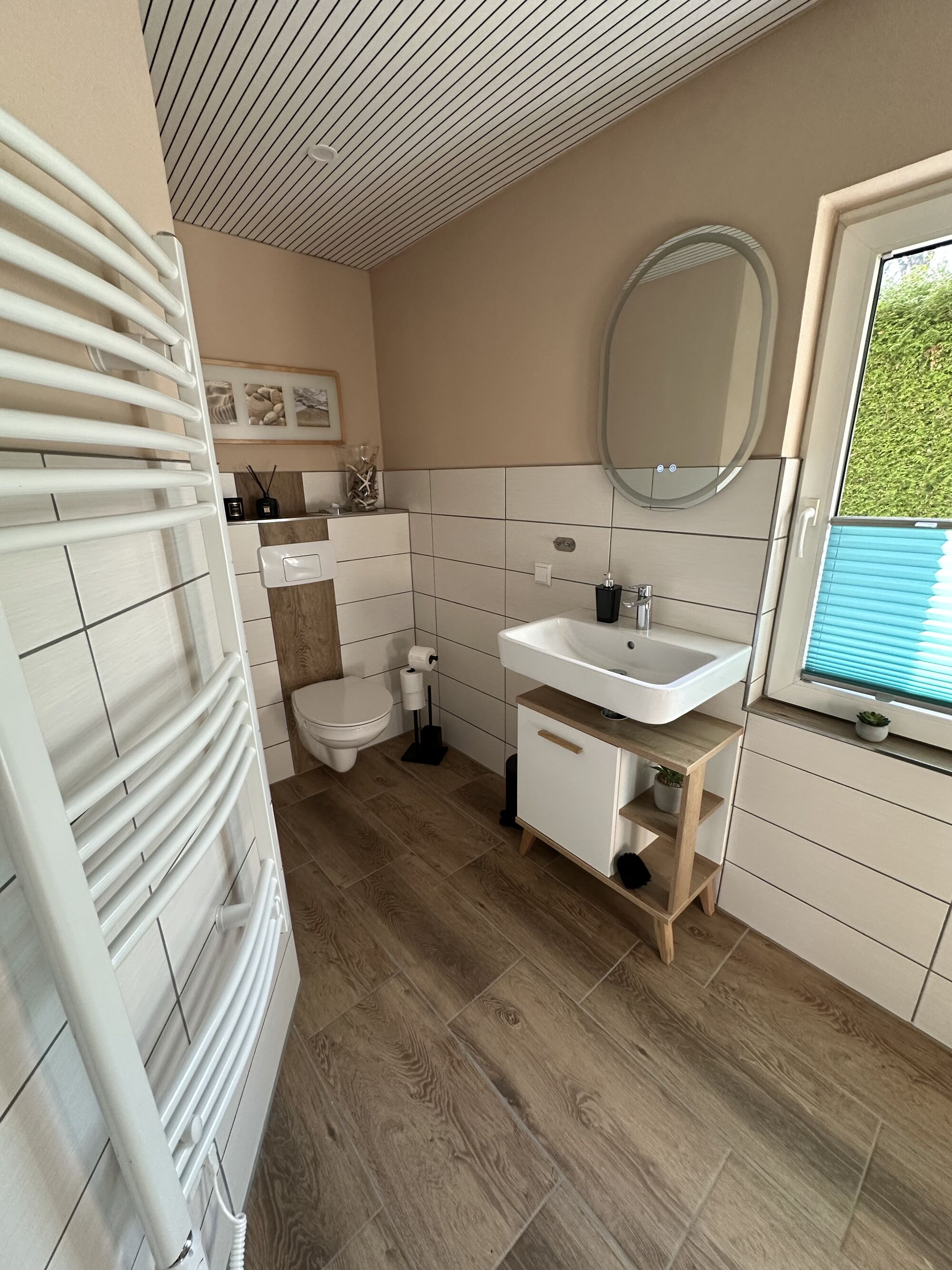 Das Tageslichtbad mit WC, Dusche und Wanne sowie Handtuchheizkörper und großem Spiegel ist modern und hell.