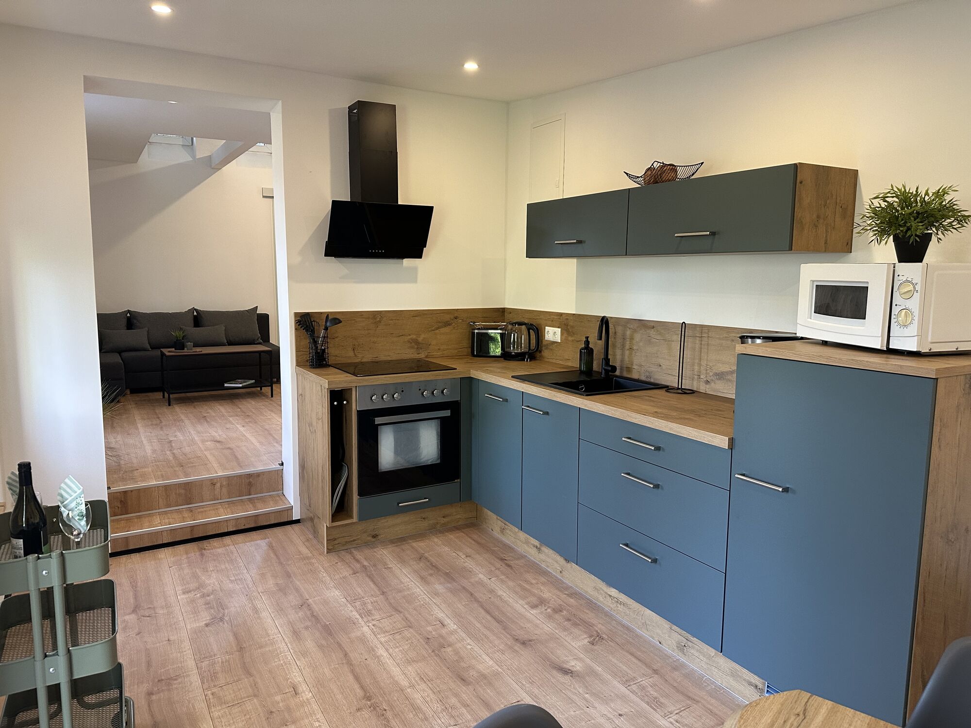 4-Platten Herd, Cerankochfeld, Dunstabzugshaube, Kühlschrank mit Gefrierfach, Korkenzieher / Flaschenöffner, Gewürze (Salz, Pfeffer, Zucker), Öl / Essig, Mülltüten