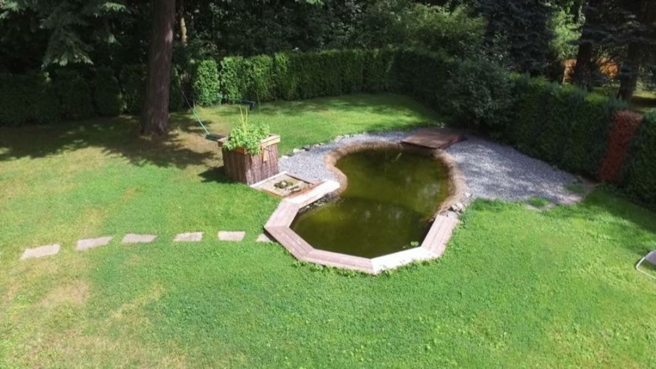 Auf einer ca. 600 m² großen Liegewiese befindet sich der kleine Hundeschwimmteich welcher extra für Vierbeiner gebaut wurde.