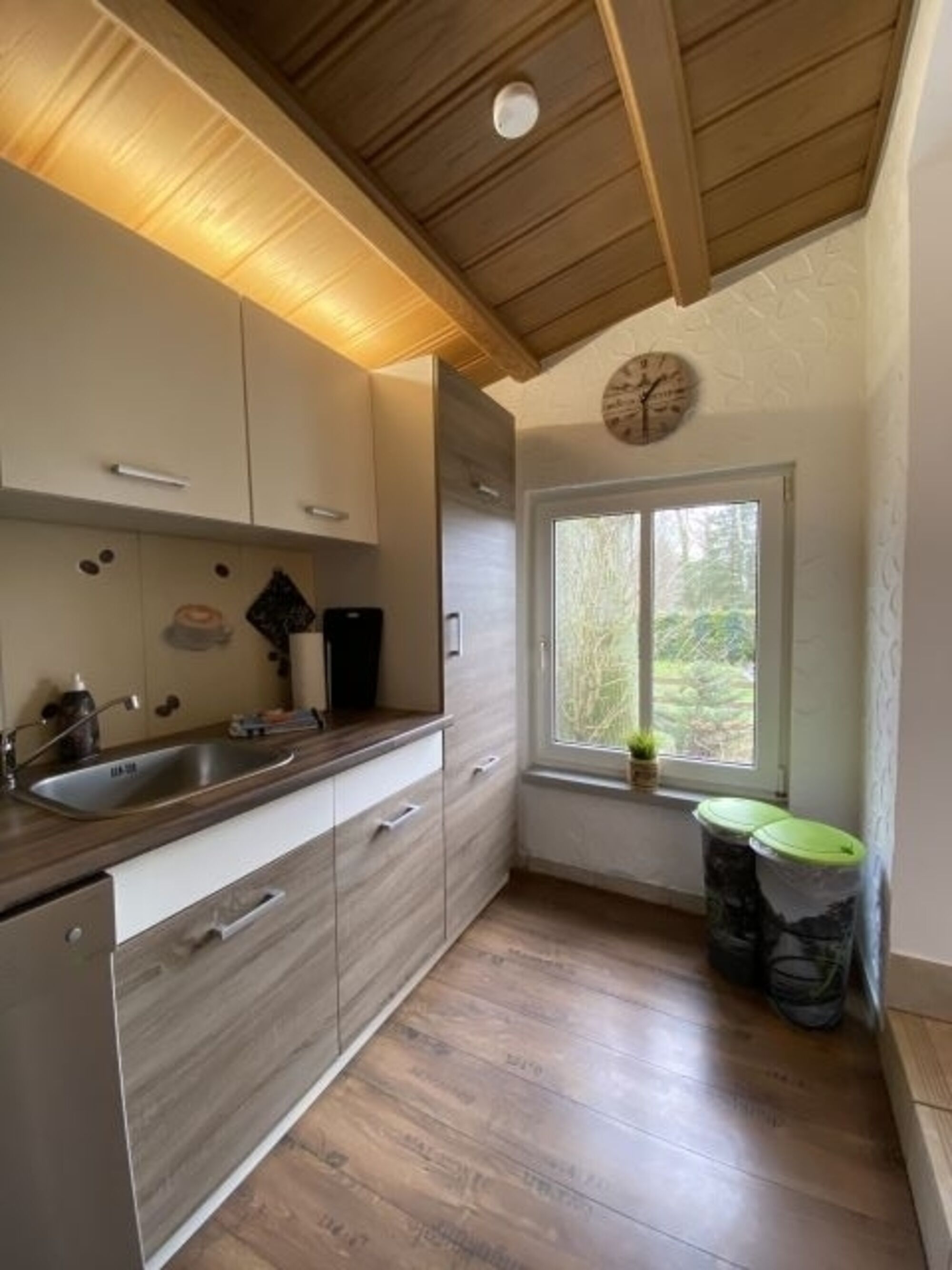 Die Wohnküche ist mit Kühlschrank und Gefrierfach sowie 4-Platten Ceranherd mit Backofen, Mikrowelle, Geschirrspüler, Kaffeemaschine, Wasserkocher, Toaster und natürlich Geschirr, Besteck, Gläsern und diversen Küchenutensilien und Schüsseln ausgestattet.