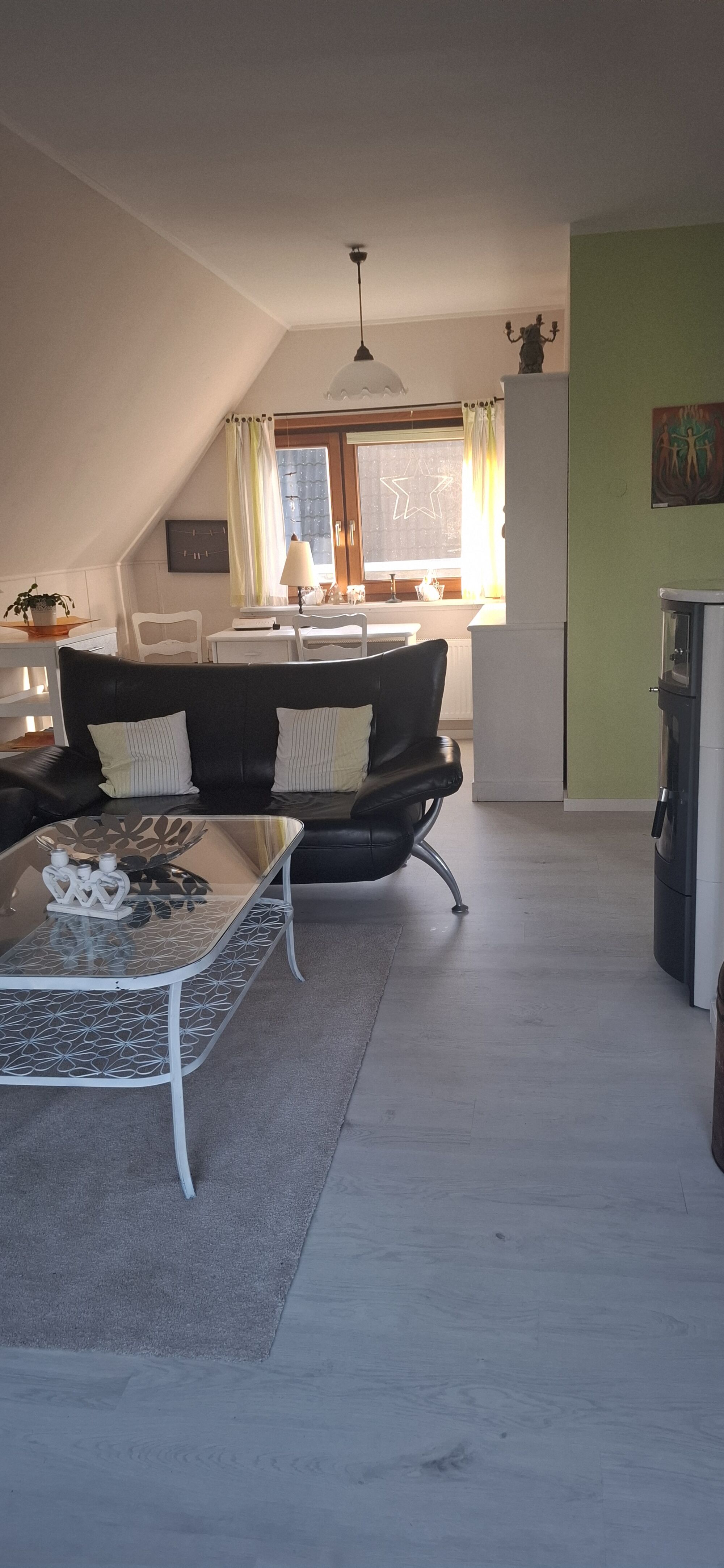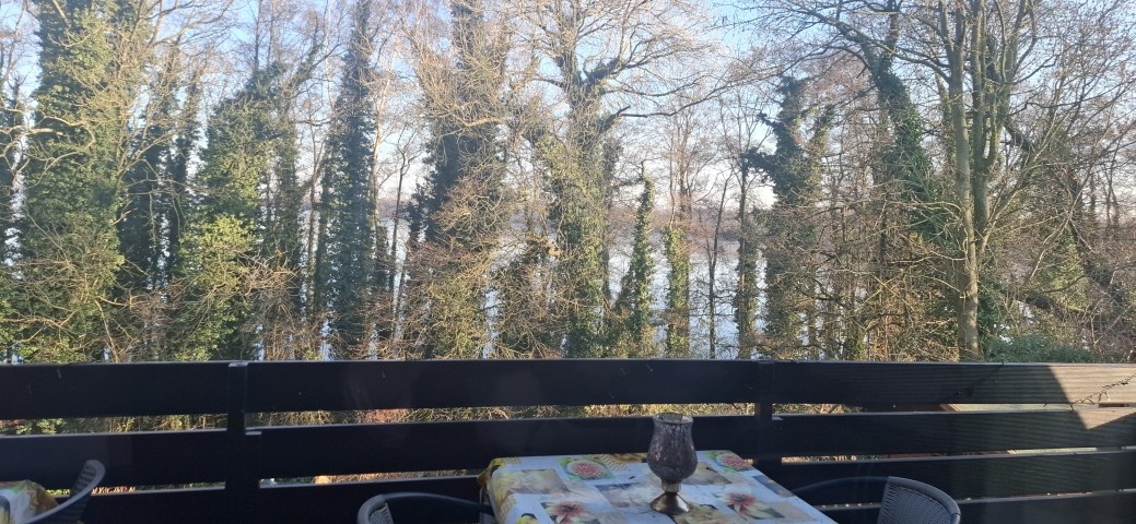 Hier ist der Eingangsbereich mit einem kleinen Flur und Gäste-WC, außerdem ein Wohn-Essbereich mit Kamin ( wir mussten ihn jetzt gegen einen Ofen austauschen , Bilder folgen ab Ende Januar 2025) und Küche und ein Balkon zum See.