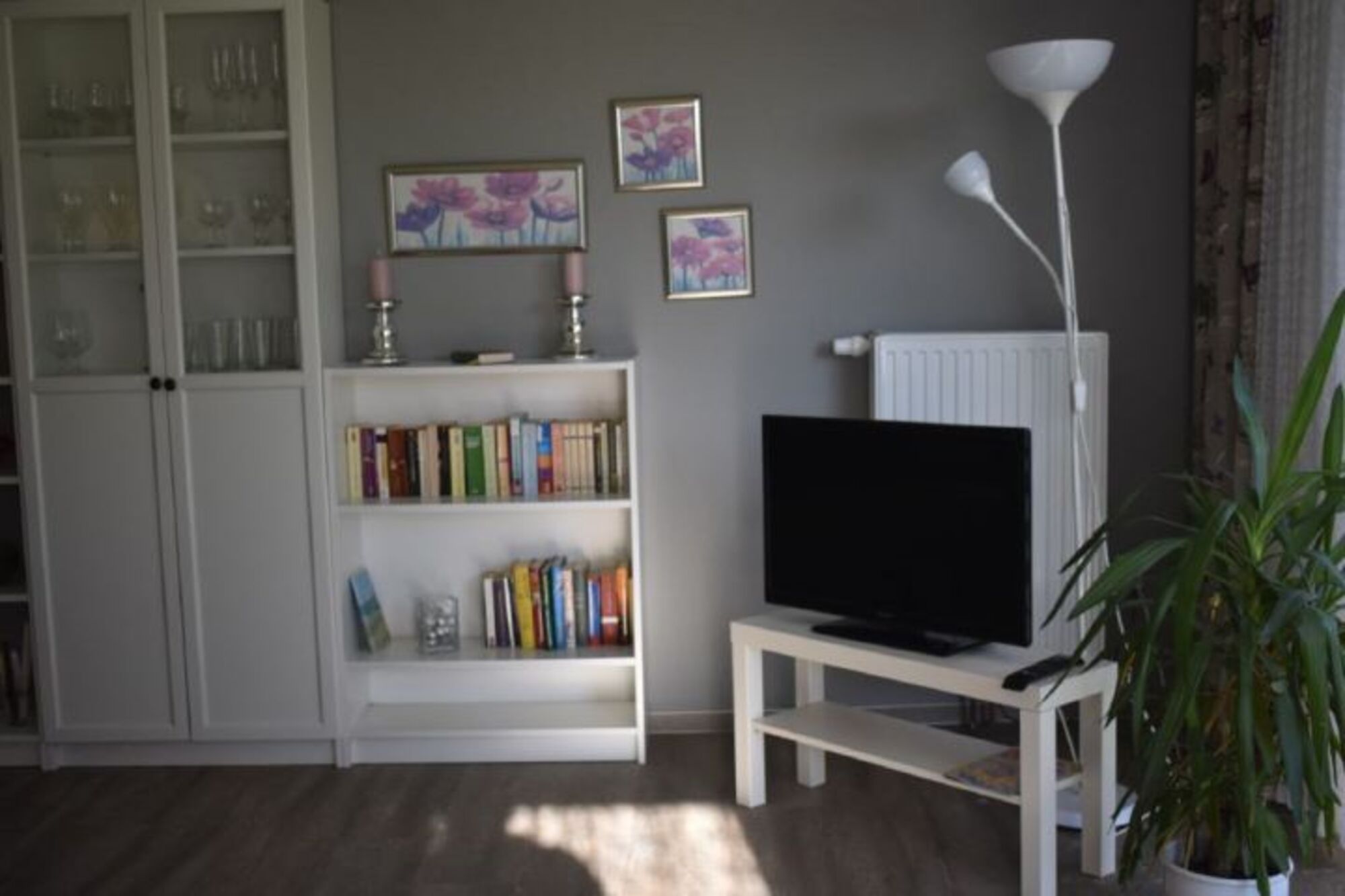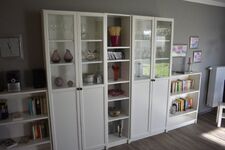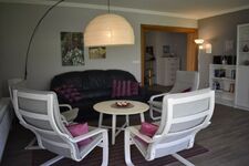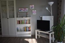 TV, TV-Sat, TV-Flachbildschirm, CD-Player, CD´s, Bücher, 3er-Sofa, Sessel, Fliegengitter