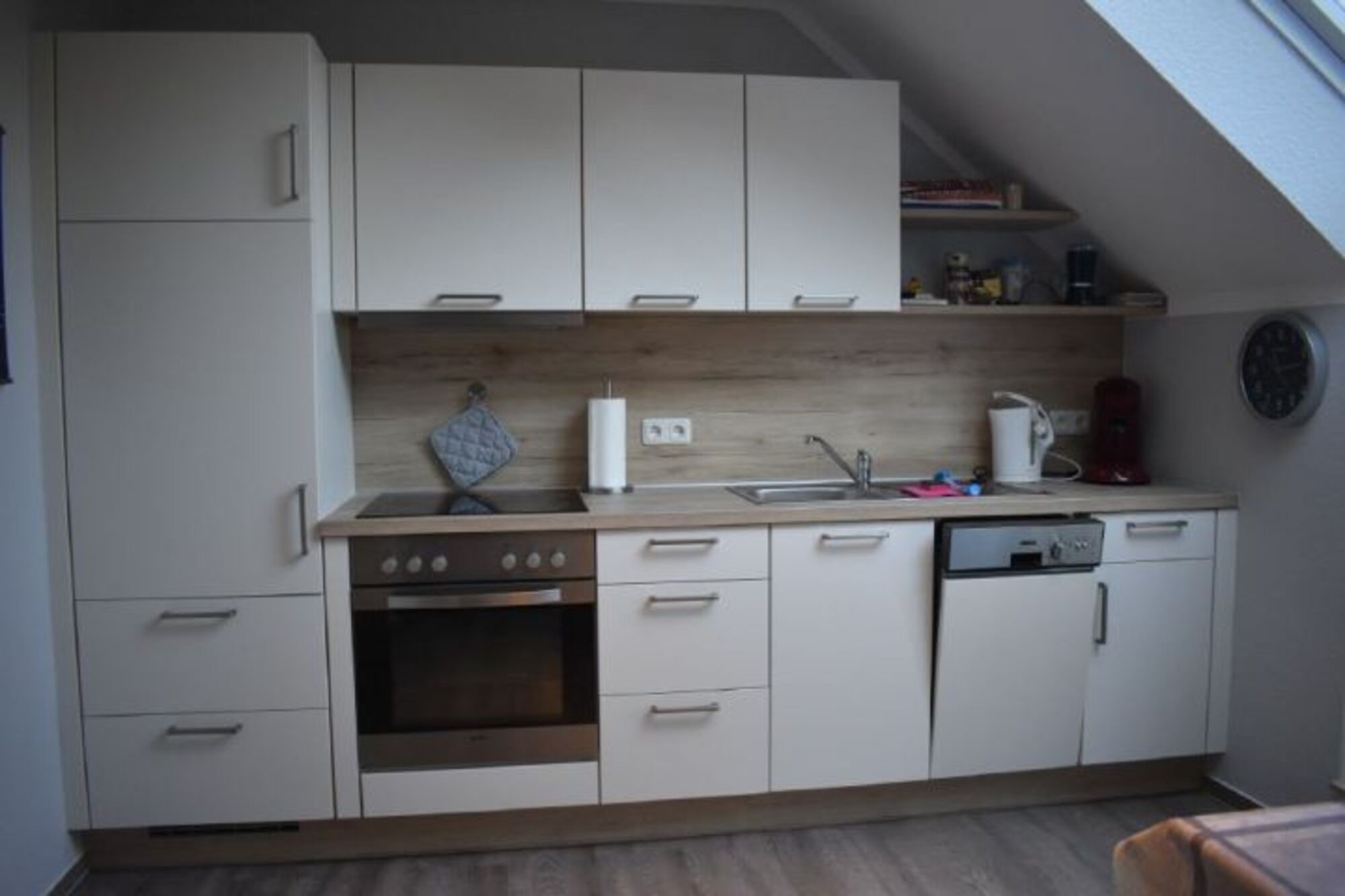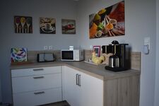 4-Platten Herd, Cerankochfeld, Dunstabzugshaube, Kühlschrank mit Gefrierfach, Gefrierschrank, Kaffeevollautomat, Senseo-Kaffeeautomat, Korkenzieher / Flaschenöffner, Gewürze (Salz, Pfeffer, Zucker), Geschirrhandtücher, Mülltüten, Essplatz in der Küche