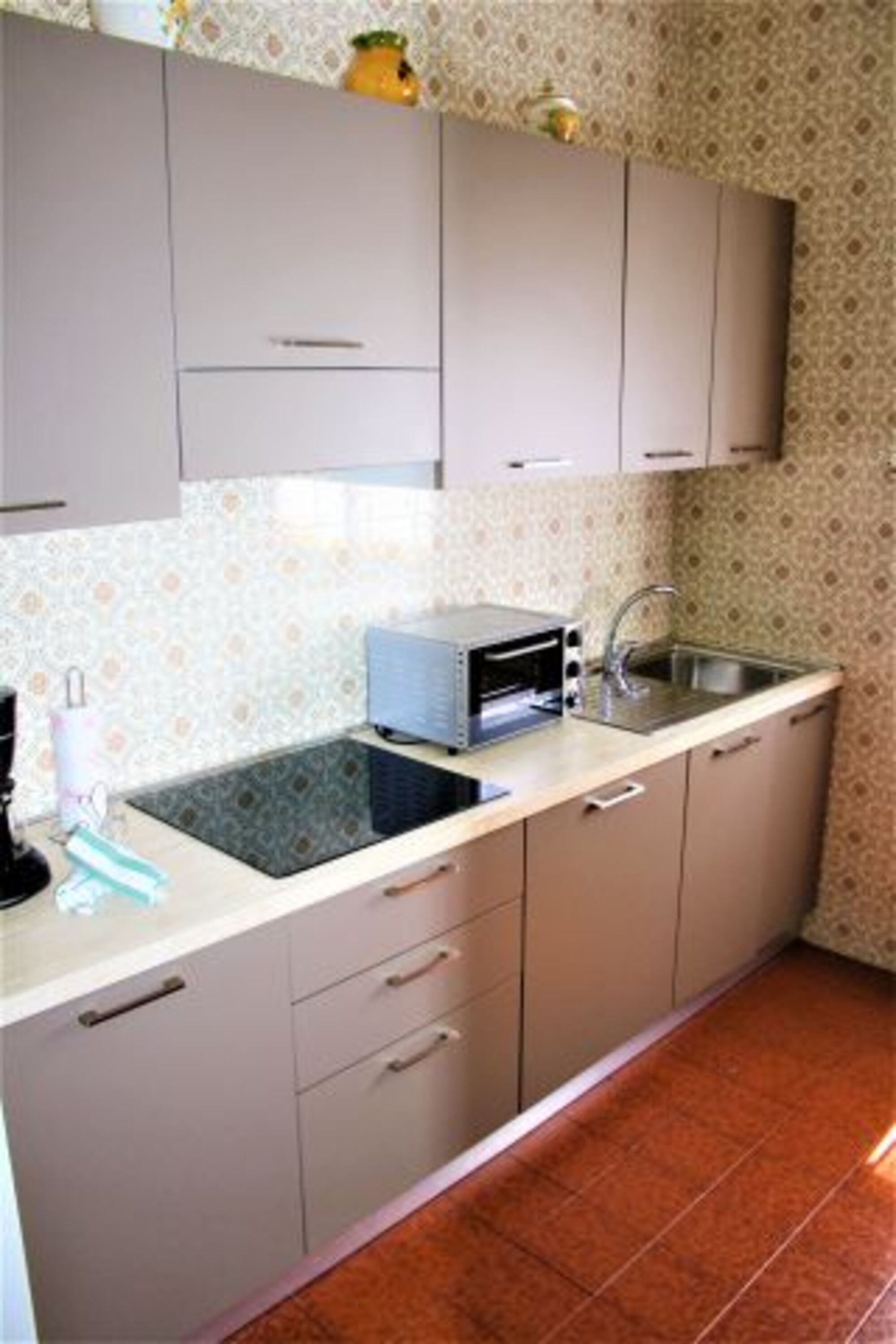 4-Platten Herd, Induktionsherd, Dunstabzugshaube, Kühlschrank mit Gefrierfach, Korkenzieher / Flaschenöffner, Geschirrhandtücher, Essplatz in der Küche