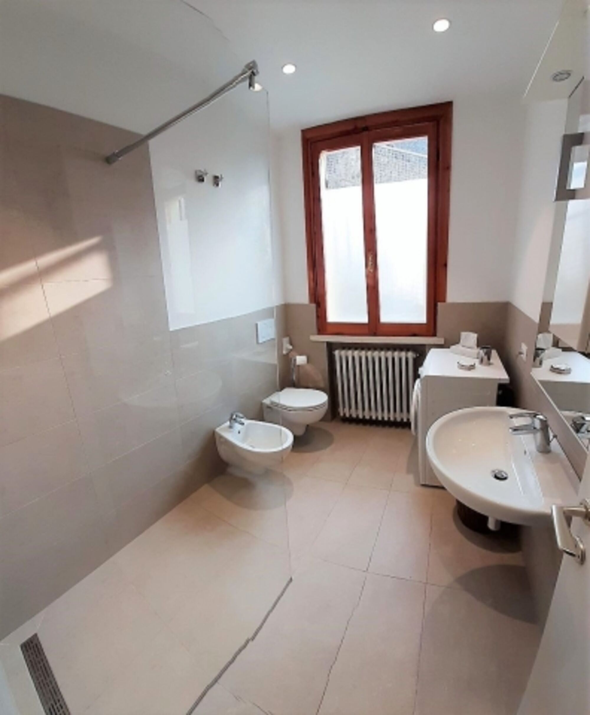 Waschbecken, Spiegel, Fenster im Bad