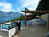 Vor dem Wohnzimmer befindet sich eine Terrasse mit Gartenmöbeln und einem fantastischen Blick auf den Gardasee und Malcesine.