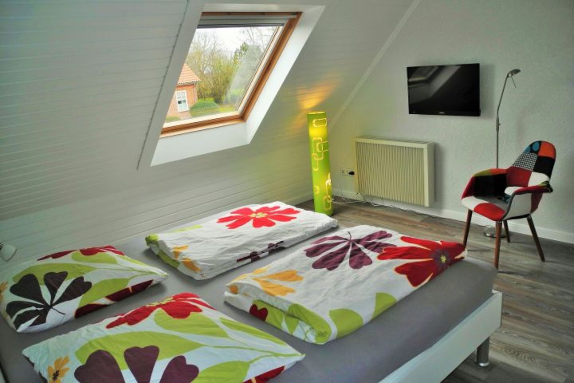 Der Dachboden ist modern ausgebaut und bietet eine Schlafmöglichkeit (1,40m x 2,00m). Vom Dachboden hat man einen sehr schönen Blick über die Felder bis zur Orther-Bucht.