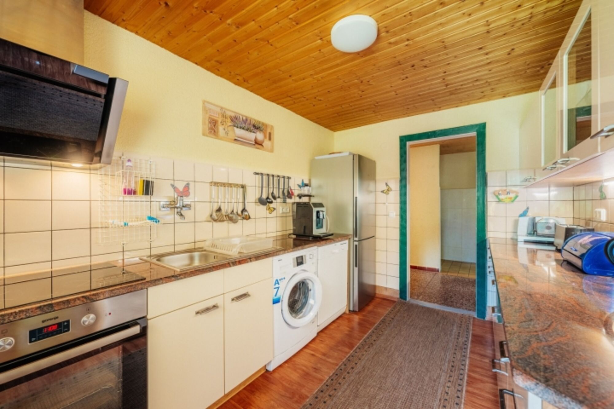 4-Platten Herd, Induktionsherd, Dunstabzugshaube, Kühlschrank mit Gefrierfach, Gefrierschrank, Kaffeevollautomat, Eierkocher, Mixer, Korkenzieher / Flaschenöffner, Gewürze (Salz, Pfeffer, Zucker), Öl / Essig, Geschirrhandtücher, Mülltüten