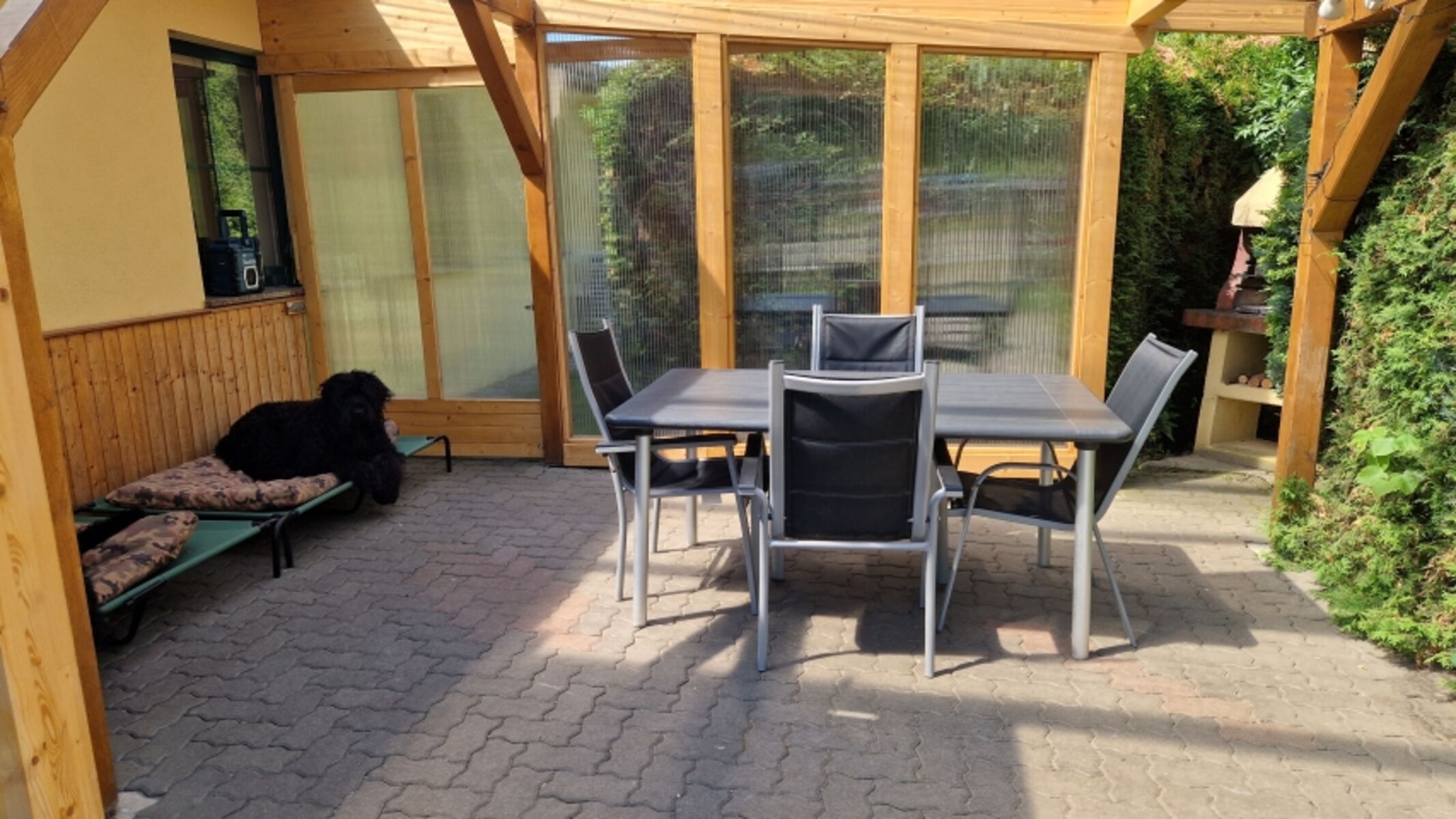 Liegewiese, Gartenmöbel, Kohlegrill, Bänke, Windschutz, Sauna im Garten