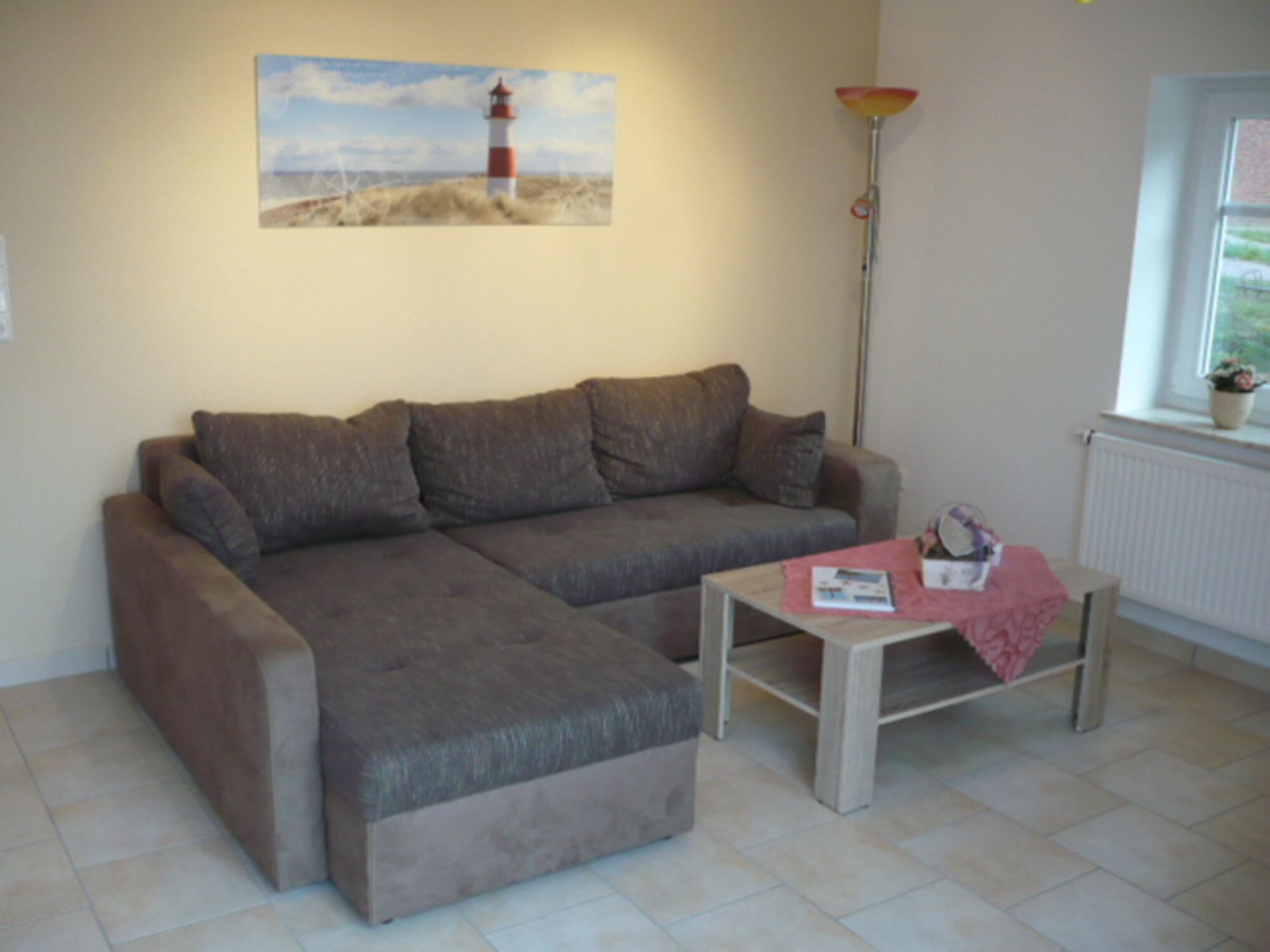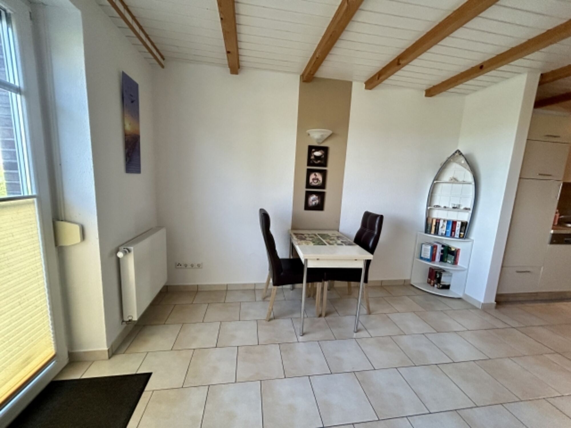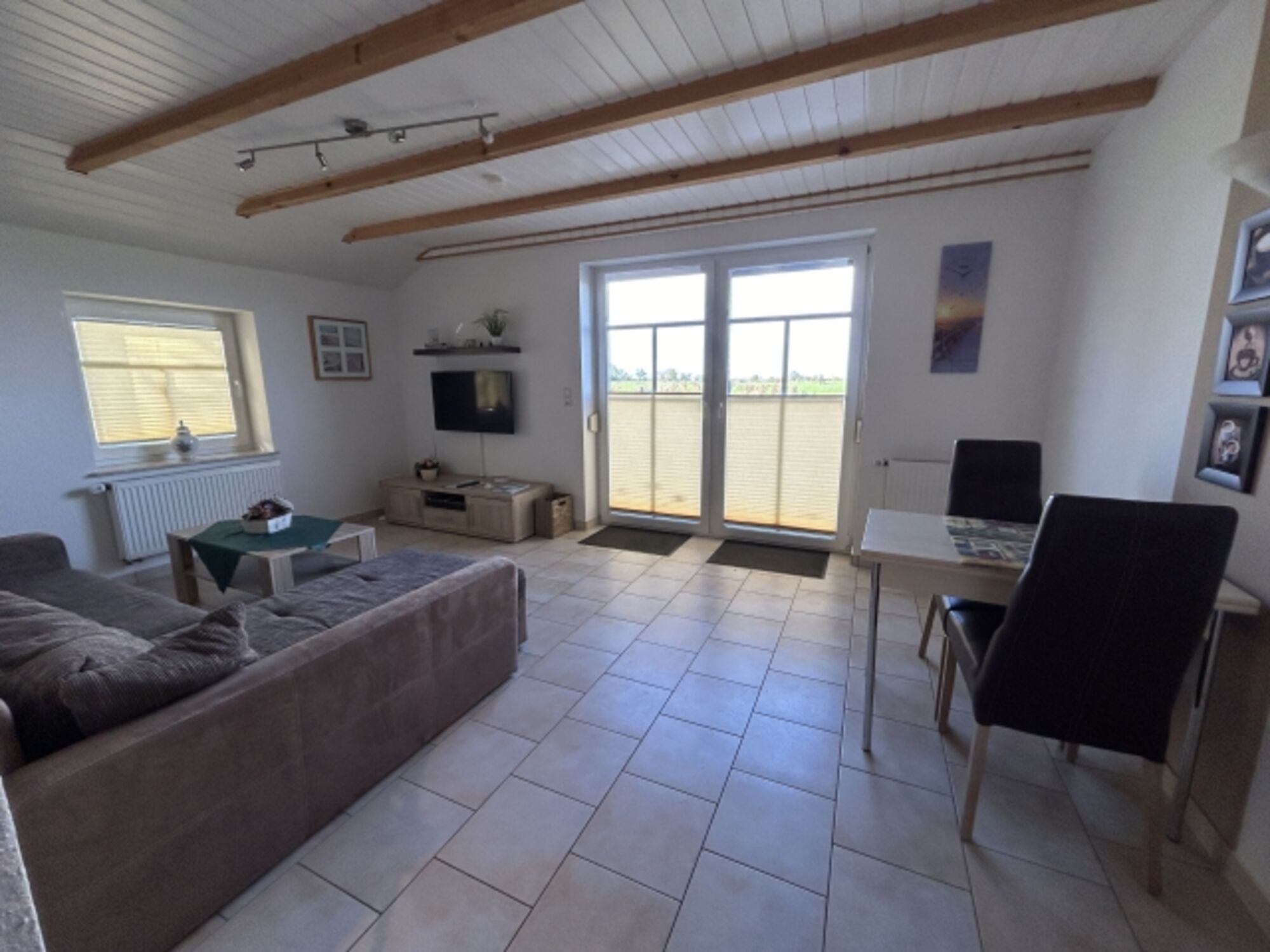 Die Wohnung ist eine Nichtraucherwohnung und befindet sich in einem 3-Parteienhaus im Erdgeschoss und ist über einen ebenerdigen Zugang leicht zu erreichen. Innen ist die Wohnung modern und zweckmässig eingerichtet. Sie verfügt über ein Badezimmer mit Dusche, Fußbodenheizung und Wandheizkörper und Fenster, im Schlafzimmer ist neben dem Doppelbett (200 x 200cm) für ein Baby oder ein Kleinkind (bis 3 Jahre) ein Kinderreisebett mit Matratze aufgestellt. Hier gibt es auch ein zweites SAT-TV. Darüber hinaus verfügt die Wohnung über eine komplett ausgestattete Einbauküche, u.a. mit einer Kaffeemaschine, einer Mikrowelle, einer Geschirrspülmaschine, einen Kühlschrank mit kleinem Gefrierfach und einen Wasserkocher. Über den Durchgang von der Küche gelangen Sie in den Wohn-/Eßbereich, der mit einem Sofa, einem LED-Fernseher, einem Radio-CD-Spieler, einem DVD-Spieler sowie einem Deckenfluter und einem Tisch mit zwei Sitzgelegenheiten ausgestattet ist. Vom Wohnzimmer aus haben Sie einen schönen Ausblick auf die Felder und Wiesen bis Neßmersiel.