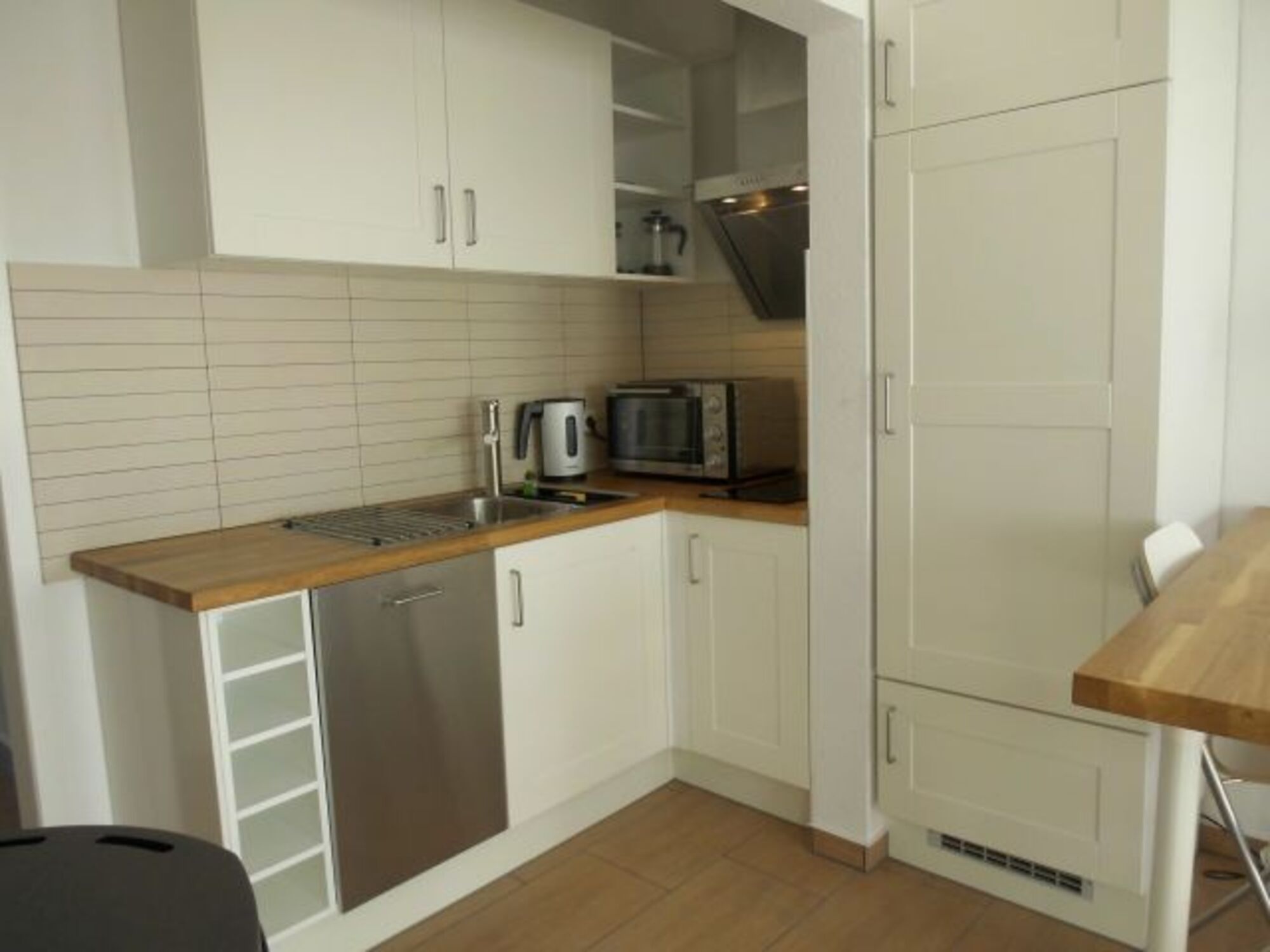 Die Pantry ist ausgestattet mit Backofen, zwei Creankochplatten, Abzugshaube, großem Kühlschrank, Geschirrspüler, Wasserkocher, Gläser, Geschirr & Besteck.