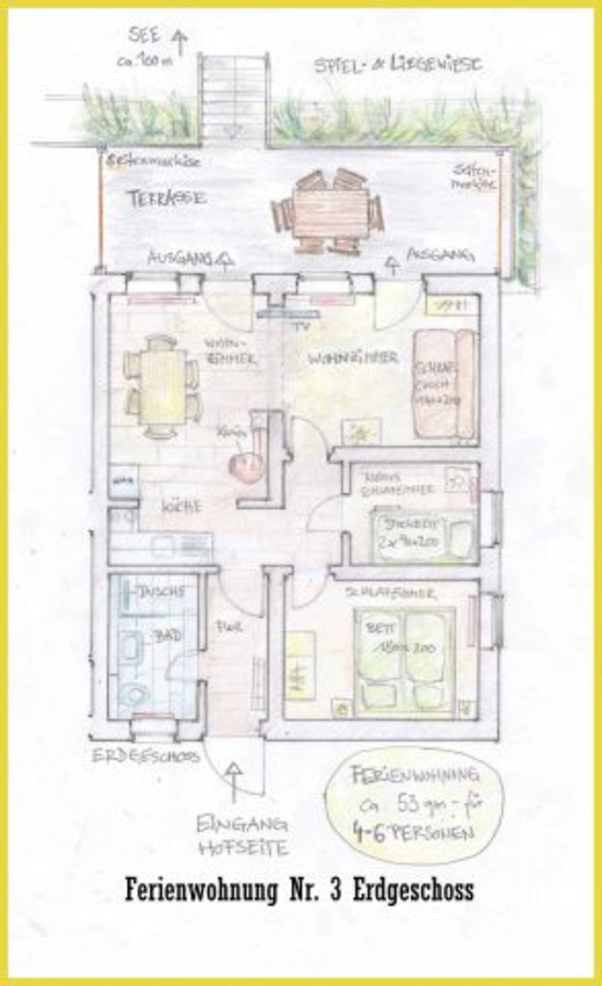 In der größten Ferienwohnung im Erdgeschoss können auf 53qm 2 bis max. 6 Personen und maximal zwei Hunde ein schönes Feriendomizil finden.