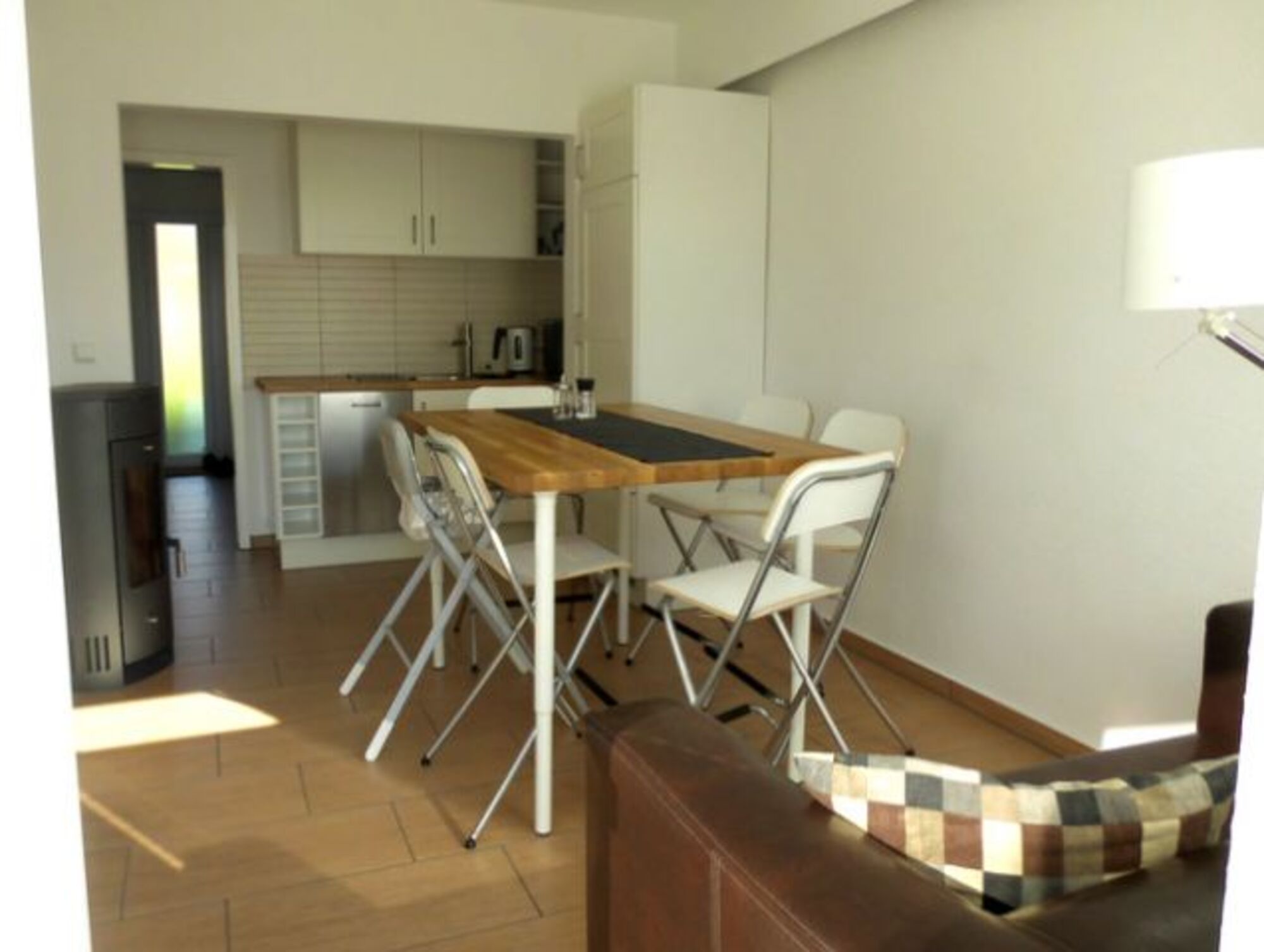 Im Wohnraum mit Balkonfenster befindet sich ein bequemes Sofa, ein Flachbild- Fernseher, ein Esstisch für 6 Personen und der Kaminofen.