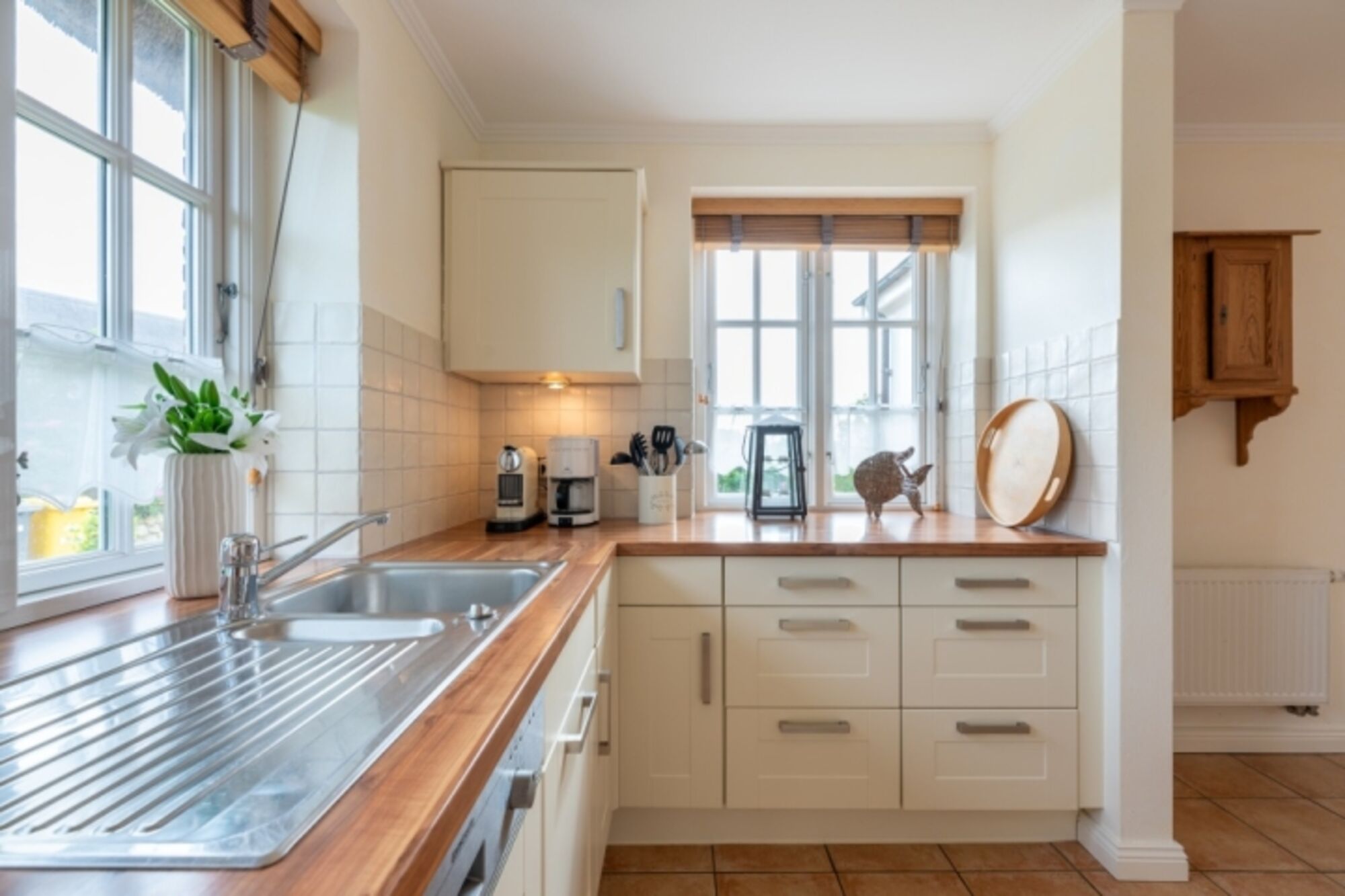 Cerankochfeld, Kühlschrank mit Gefrierfach, Nespresso-Automat, Mixer, Korkenzieher / Flaschenöffner, Öl / Essig, Geschirrhandtücher