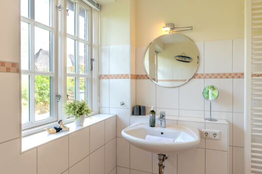 Waschbecken, Spiegel, Fenster im Bad