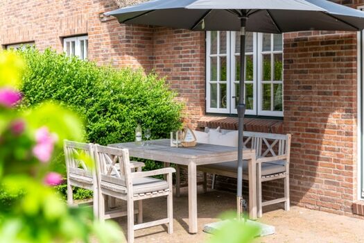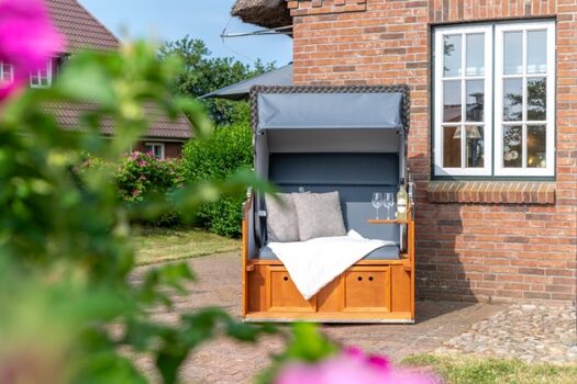 Der ruhige Garten mit Terrasse ist mit Gartenmöbeln und einem Strandkorb ausgestattet und von einem Friesenwall umgeben.