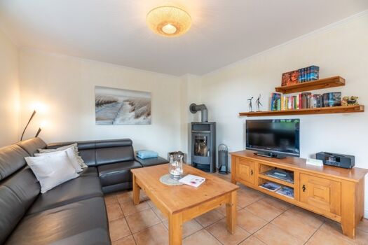TV-Sat, TV-Flachbildschirm, DVD-Player, CD´s, Bücher, Kaminofen, Eckcouch, Sessel