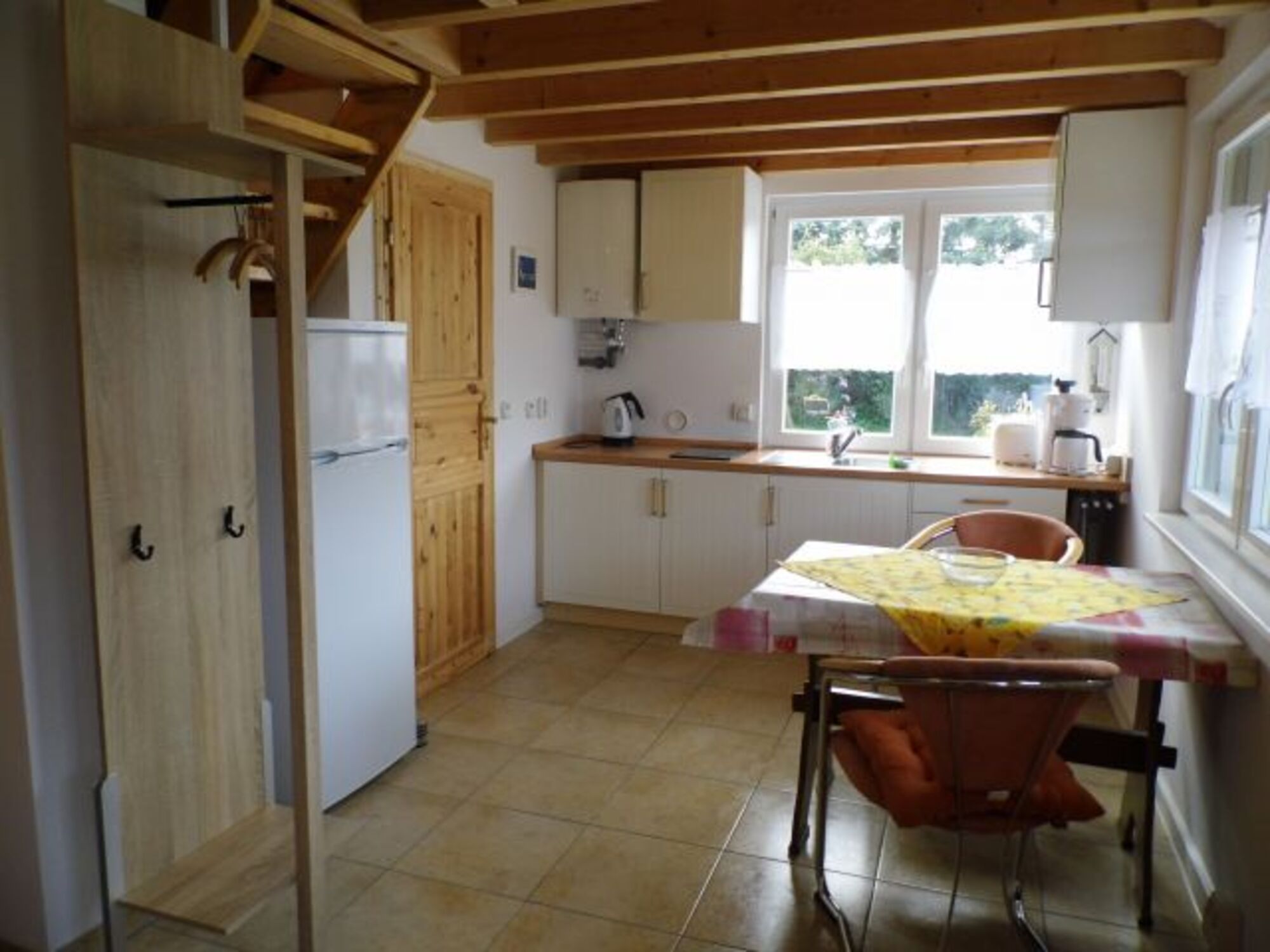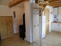 2-Platten Herd, Kühlschrank mit Gefrierfach, Eierkocher, Mixer, Mülltüten, Essplatz in der Küche, TV in der Küche