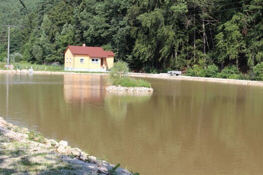Eigener Angelweiher (7.500 qm) in unmittelbarer Nähe am Haus (30 Meter) besetzt mit Forelle, Saibling, Karpfen, Schleie, Stör, Zander, Hecht, div. Weißfische,