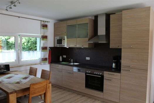 4-Platten Herd, Cerankochfeld, Dunstabzugshaube, Kühlschrank mit Gefrierfach, Eierkocher, Mixer, Korkenzieher / Flaschenöffner, Geschirrhandtücher, Essplatz in der Küche, TV in der Küche