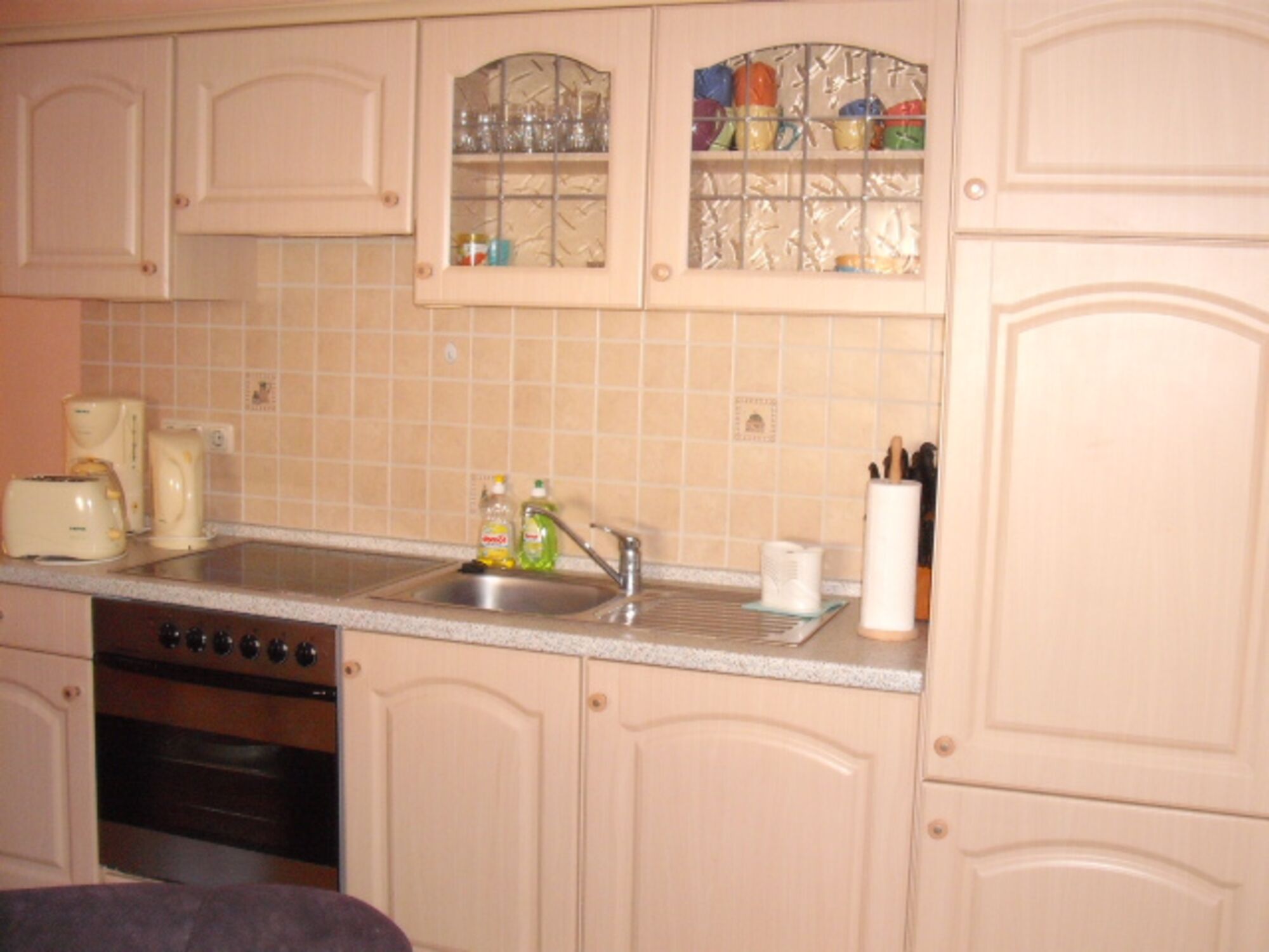 Sie verfügt über einen 4-Plattenherd aus Ceran, einem Backofen,einer Microwelle, einer Kühl-,Gefrierkombi, Kaffeemaschine, Toaster und Wasserkocher.