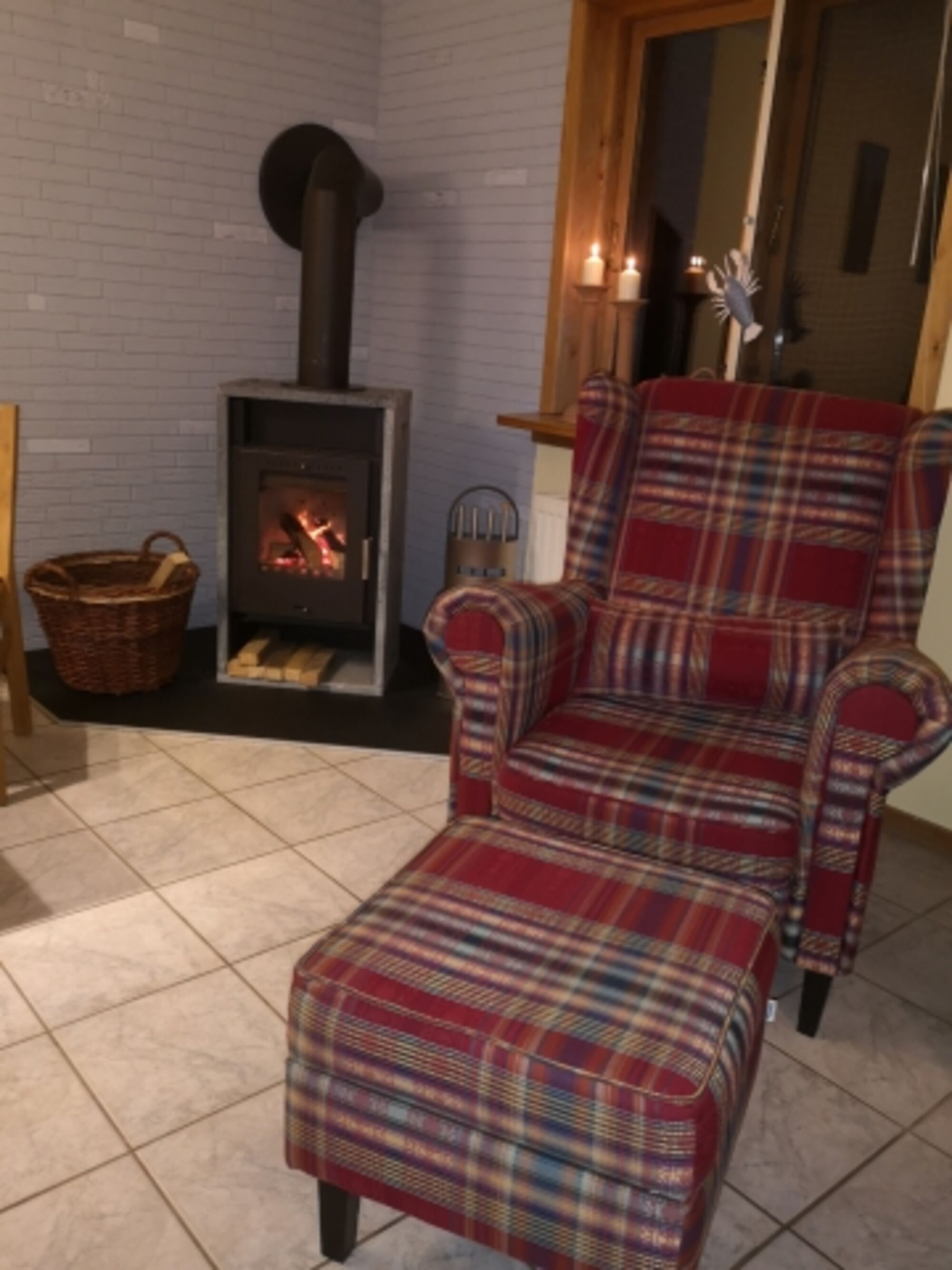 Das Wohnzimmer ist mit dem Esszimmer kombiniert und bietet Platz auf Bank und Stühle für bis zu 8 Pers. Ein Zweier.- und ein Dreier-Sofa laden zum Verweilen ein. Ruhe Sessel mit Hocker. Ein dänischer Kamin sorgt für angenehme Wärme. Hier im Wohnzimmer befindet sich der Ausgang zur Terrasse und Garten. Vor der Terassentür befindet sich ein Insektenschutzgitter.