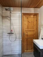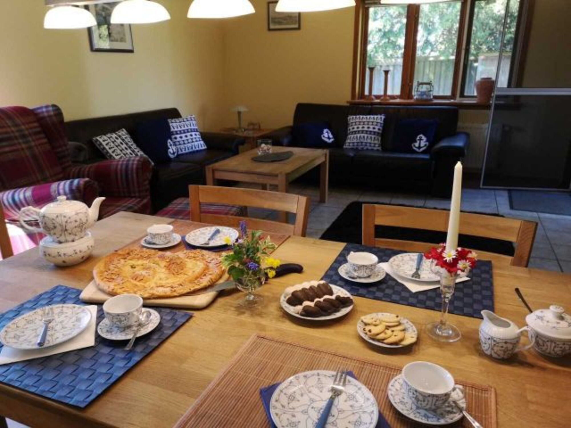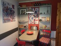 Im Flur befindet sich eine Garderobe und ein großer Spiegel. Es gibt 2 Bäder, hier spürt man das maritime Feeling. :-) Eins ist mit fast ebenerdiger Runddusche und das andere mit ebenerdiger Dusche Walk In ausgestattet. Die Fenster im Bad haben Sonnenschutzgläser, sind matt gesandstrahlt und haben Insektenschutzgitter. Die urige gemütliche Küche bietet Platz für bis zu 3/4 Pers. und bietet alle Elektrogeräte wie Backofen, Herd, Spülmaschine, Kaffeemaschine, Toaster, Waffeleisen, Mikrowelle, Wasserkocher, Kühlschrank mit Gefrierfach, Radio, sowie Wasserfilter, reichlich Geschirr, Töpfe, Pfannen, Gläser und Schüsseln. Hier gibt es nichts Abgezähltes. Nebenan befindet sich die Abstellkammer mit einen kleinen mobilen Gefrierschrank, Putz-Utensilien, Staubsauer, Wäscheständer und Waschmaschine.