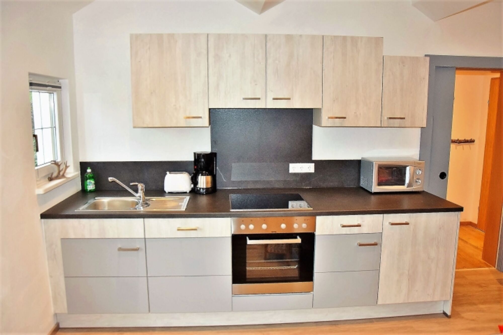 1 sehr großer Wohnraum mit sehr großem Schlafsofa und voll eingerichteter Wohnküche (Elektroherd, Microwelle, Backrohr, Kaffeemaschine,