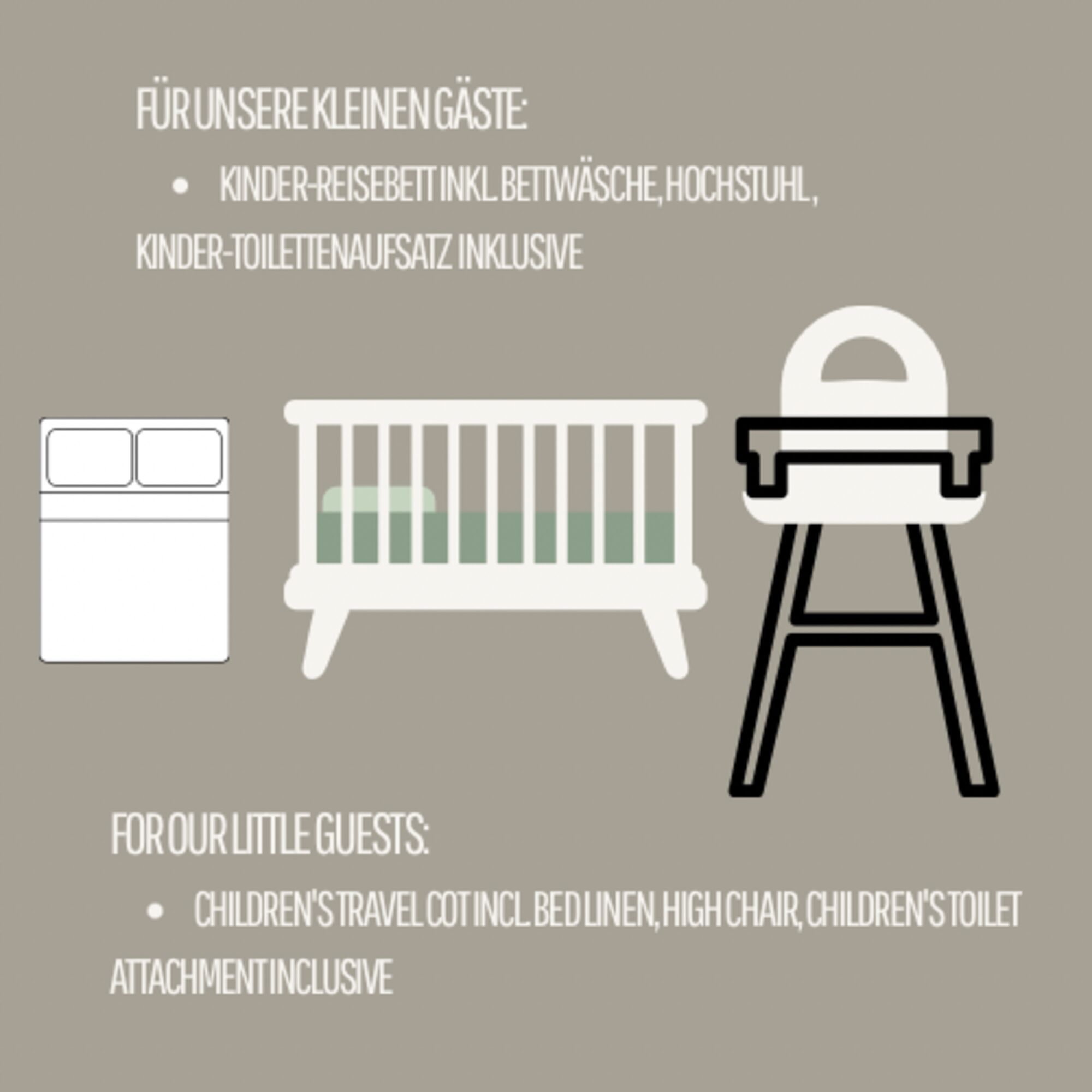 - Babybett (Gebühr), Hochstuhl (kostenfrei)