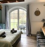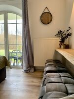 Die private Terrasse und das Apartment bieten einen Blick ins Grüne, das riesige parkähnliche Grundstück grenzt an ein Rehgehege. Für Freizeitspaß im Garten stehen Tischtennisplatte und Sauna im Haus zur Verfügung.