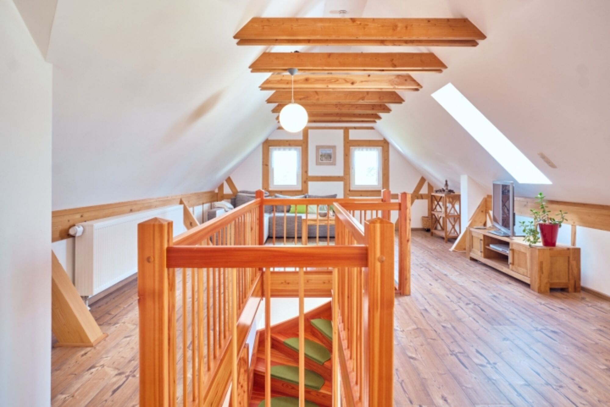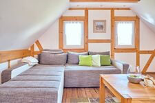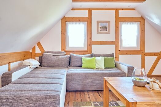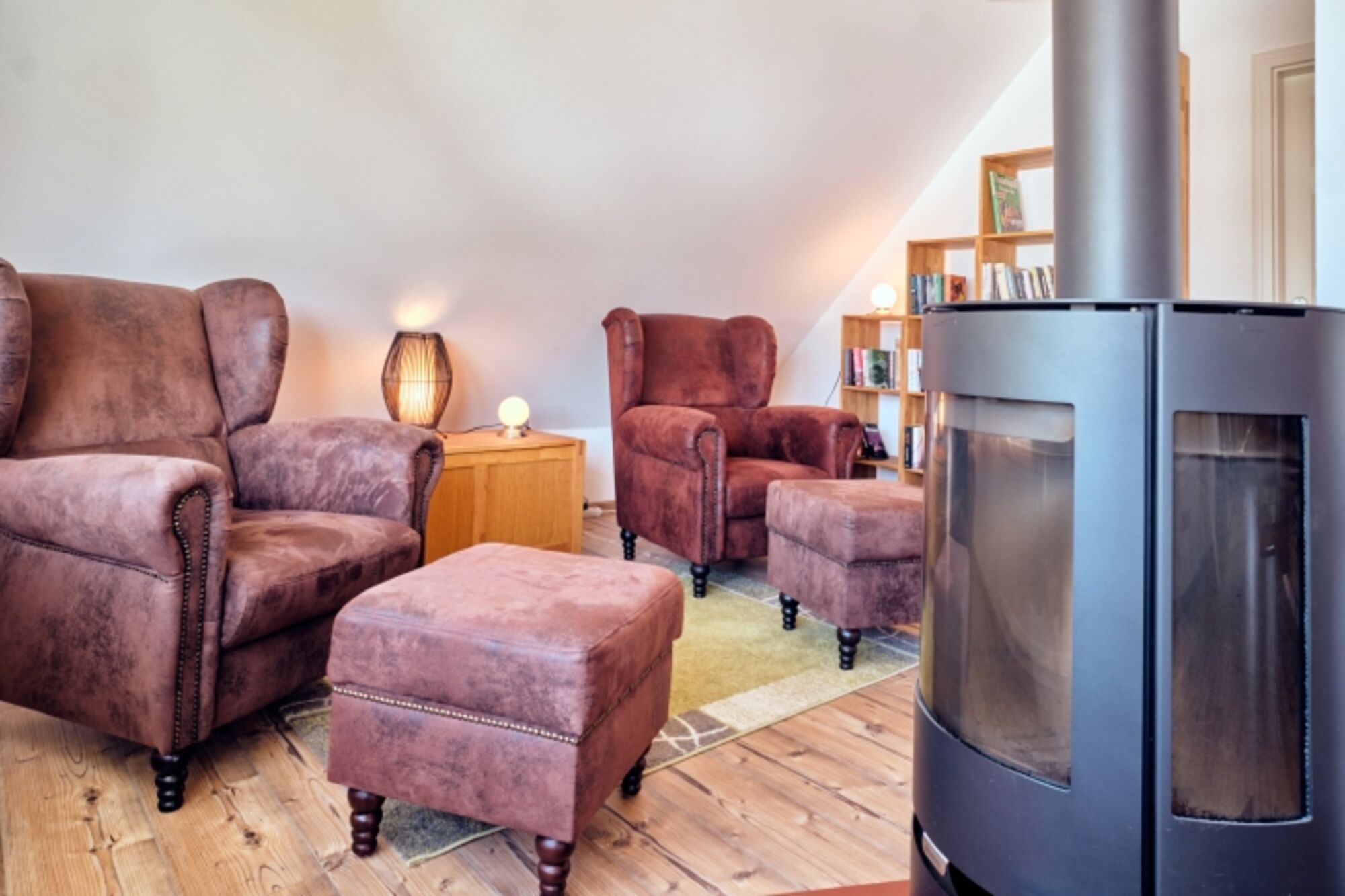 1 Galerie im OG: Kaminofen, 1 Schlafsofa, 2 Ohrensessel (Fußboden: Laminat)