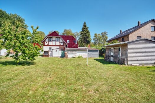 Garten: ca. 1.000 m² großes, komplett eingezäuntes Grundstück (mit Maschendraht verstärkte Hecke, Holzzaun, ca. 100 - 140 cm hoch), Terrasse