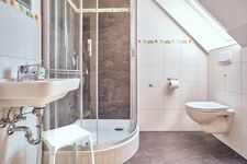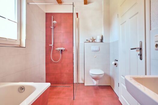 Bad: 1 Vollbad mit 1 ebenerdigen Dusche, WC und Fön im EG; Fußboden: Fliesen mit Fußbodenheizung; 1 Duschbad mit WC im OG; Fußboden: Fliesen