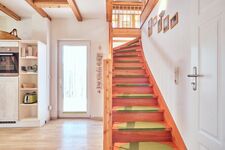 1 geschlossene, mit Teppichmonden belegte Holztreppe ins OG