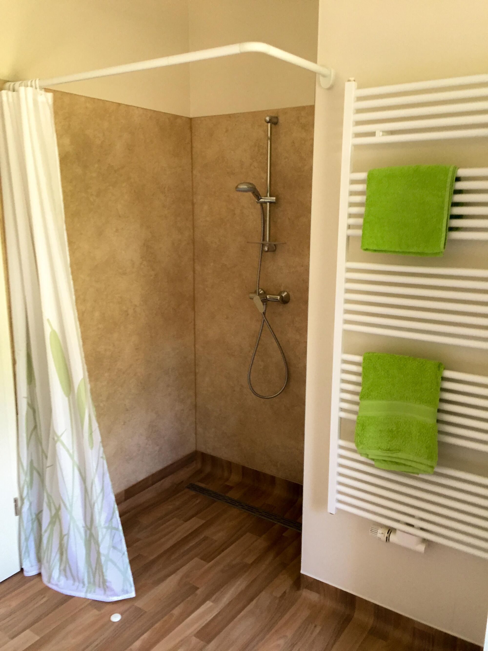 Dusche mit flacher Duschwanne und Vorhang