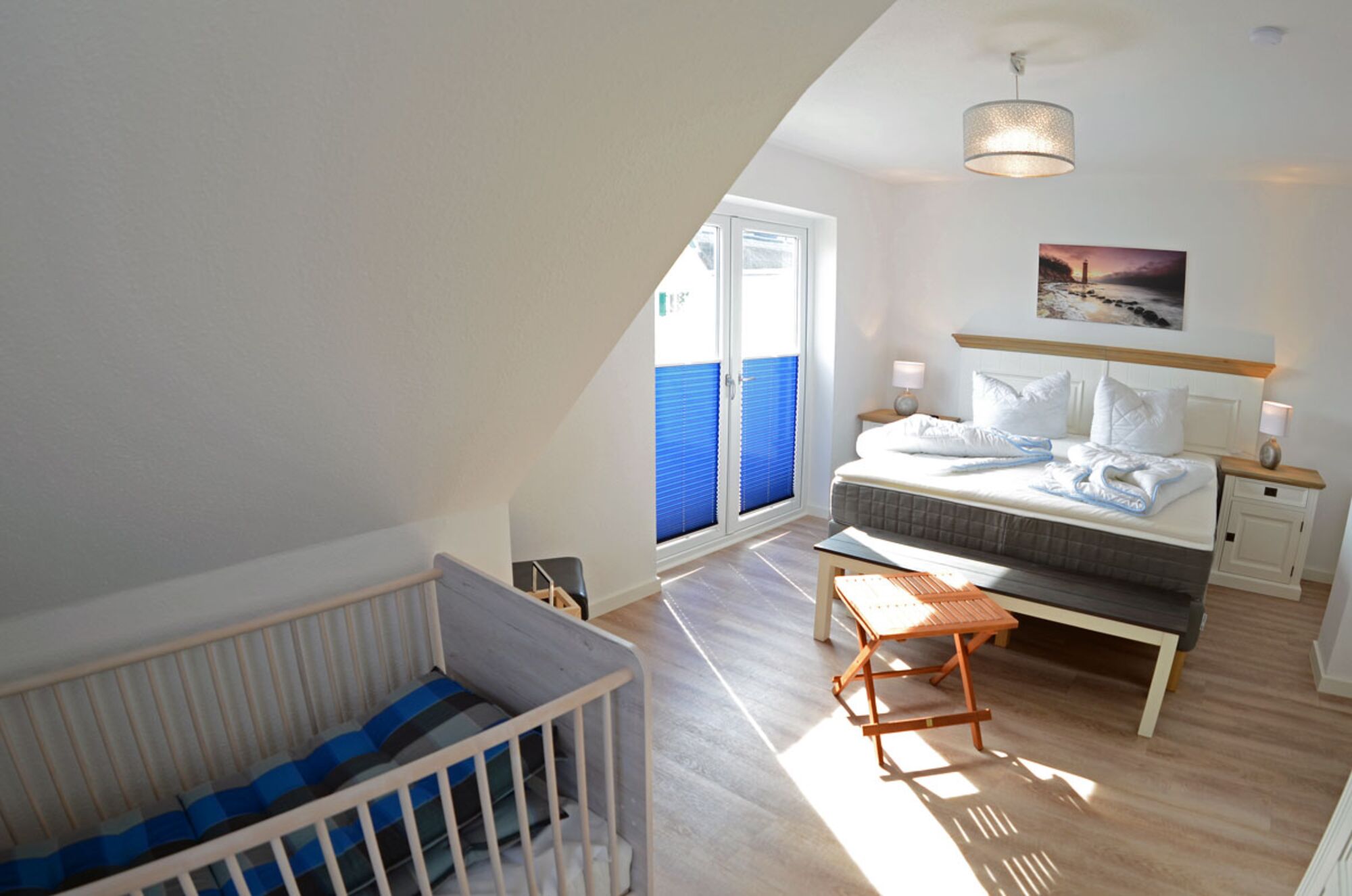 Die 2 Kajüten im OG sind mit Boxspringdoppelbetten ausgestattet. Das große, zum Bodden zeigende, beherbergt noch das Kleinkindbett und ist mit einem Fernseher ausgestattet. Von hier kommen Sie auch auf den Balkon und können nach einem oder mehrerer Saunagängen, die Seele bei einem Glas Ihrer Wahl, baumeln lassen. Das Straßenseitig gelegene Schlafzimmer besitzt noch kein Fernsehgerät, aber was nicht ist kann ja noch werden.