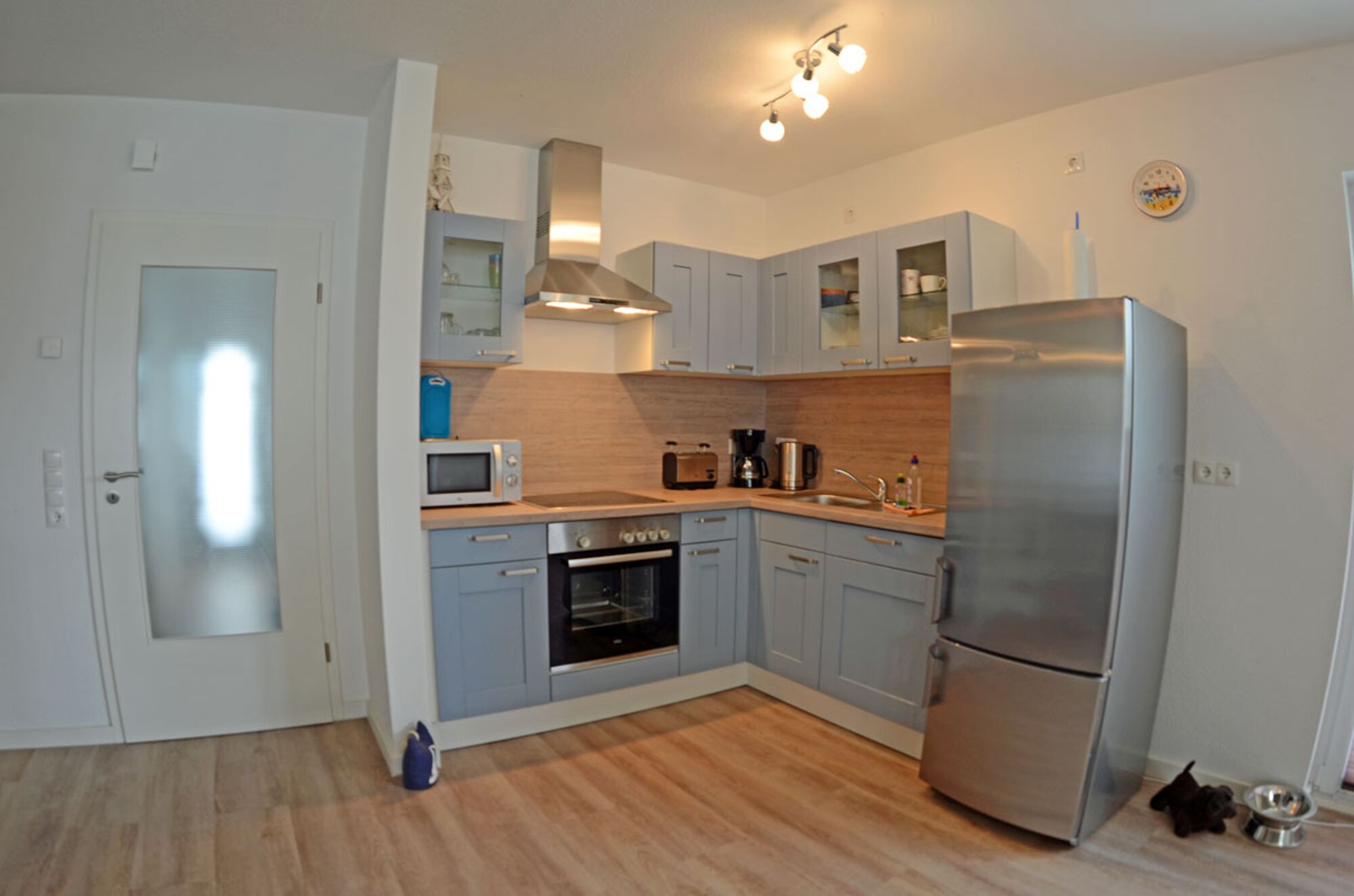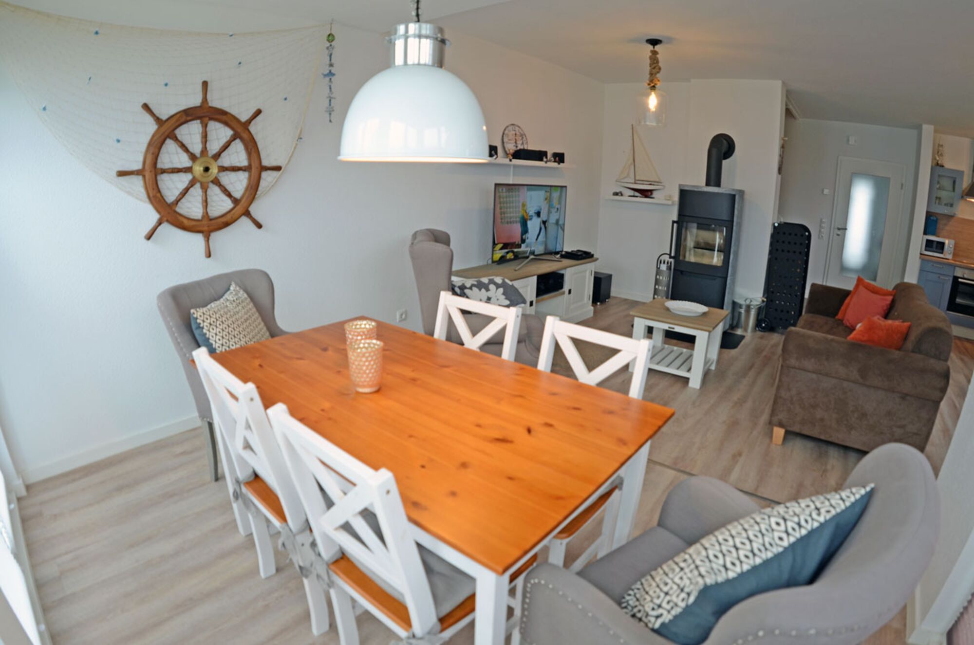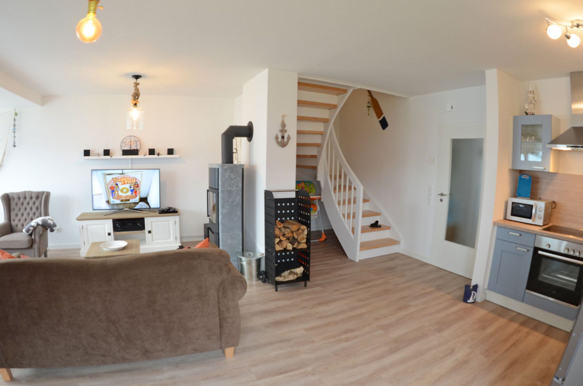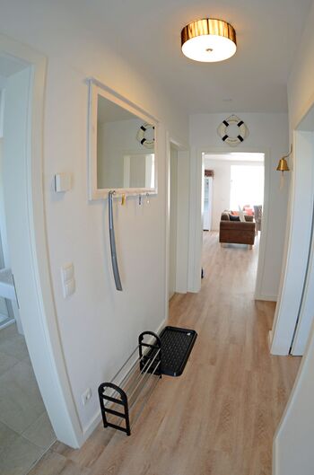 Sie starten den Gang ins Haus im EG, mit dem Flur. Von hier gehen ein Duschbad, ein Kinderzimmer mit Etagenbett und Kleiderschrank und der Heizungsraum mit Waschmaschine, ab. Eine kleine Garderobe bietet Platz für Jacken und Schuhe. Und wenn Sie alle zu Tisch rufen möchten, finden Sie hier auch die Schiffsglocke.