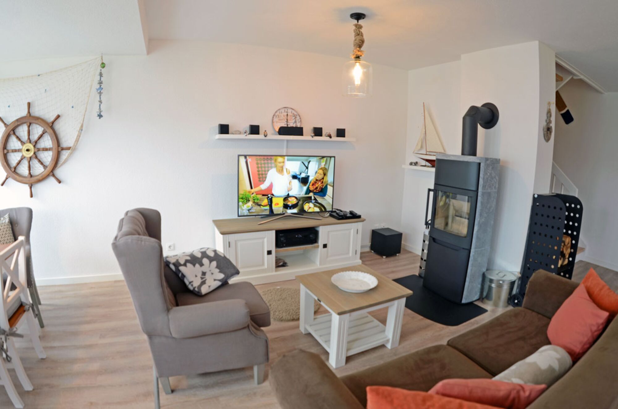 Steuerbord geht es hinauf zu den 2 großen Kajüten. Im Zentrum des Raumes steht eine Coach, ein Sessel und der einladende Kaminofen. Angrenzend befindet sich der kleine Wintergarten mit Esstisch und Steuerrad.
