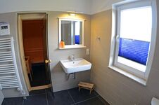 Das große Duschbad im OG, besitzt eine kleine aber feine Sauna, wo Sie nach Herzenslust schwitzen dürfen in Ihrem Rügen Urlaub.