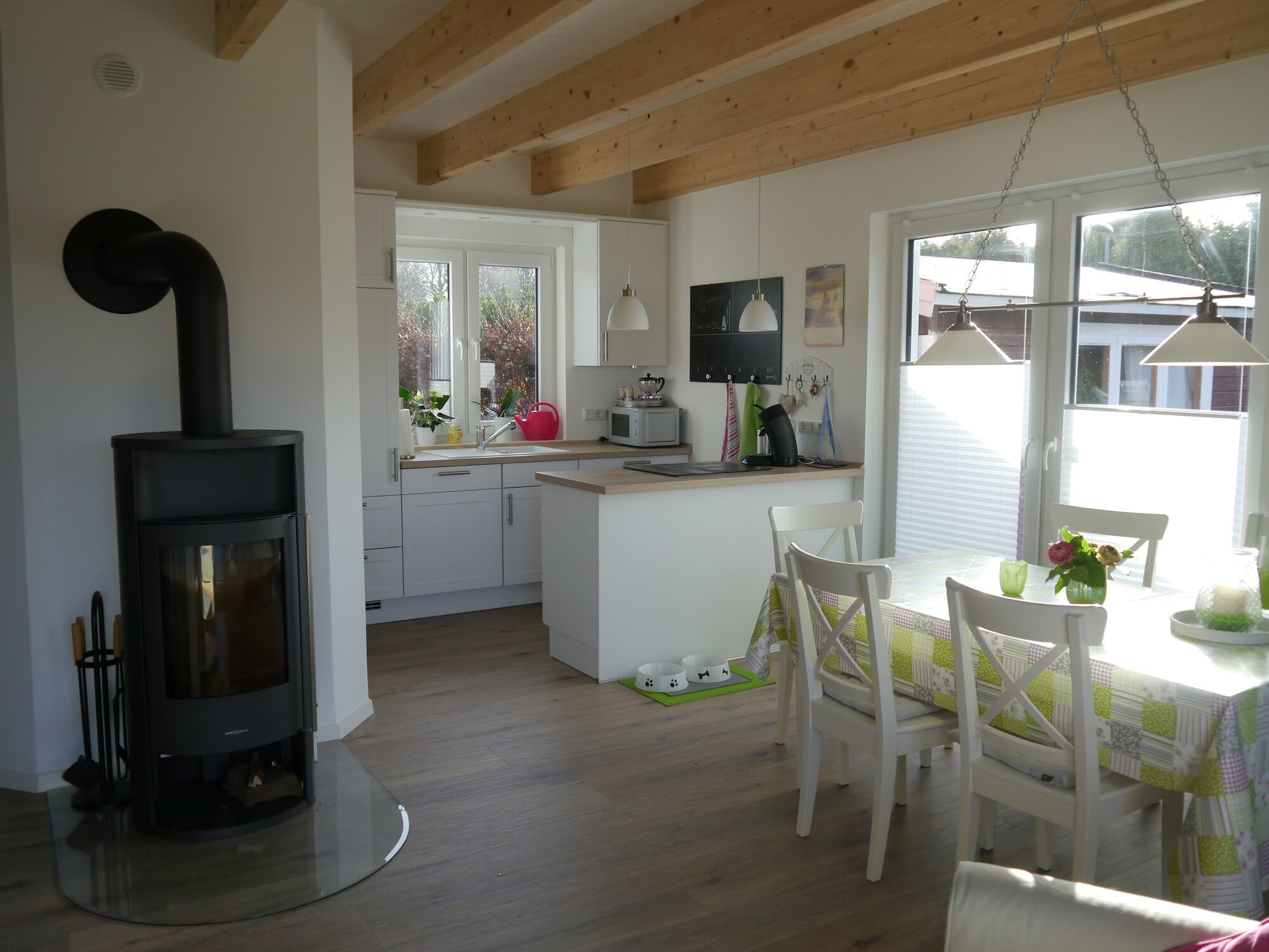 Willkommen in unserem 2017 erbauten Ferienhaus am See, ideal für Hundeliebhaber. Es erwartet sie ein liebevoll eingerichtetes Ferienhaus im nordischen Stil. Im Erdgeschoss befindet sich ein Schlafzimmer mit Doppelbett (180x200), TV-Gerät und bodentiefem Fenster mit Zugang zur Terrasse. Der offene Wohnbereich besteht aus einer großen Essecke, einer gemütlichen Sitzgruppe und einer offenen, komplett ausgestatteten Küche. Das moderne Bad verfügt über eine barrierefreie Dusche. Das 2. Schlafzimmer mit Doppelbett (180x200) befindet sich im Obergeschoss, ebenso eine gemütliche Coach mit TV-Ecke. Zu dem Haus gehört ein vollständig eingezäunter Garten mit Terrasse und Loungegruppe. Das Ferienhaus liegt im Cuxland am Sieverner See mit direktem Seezugang.