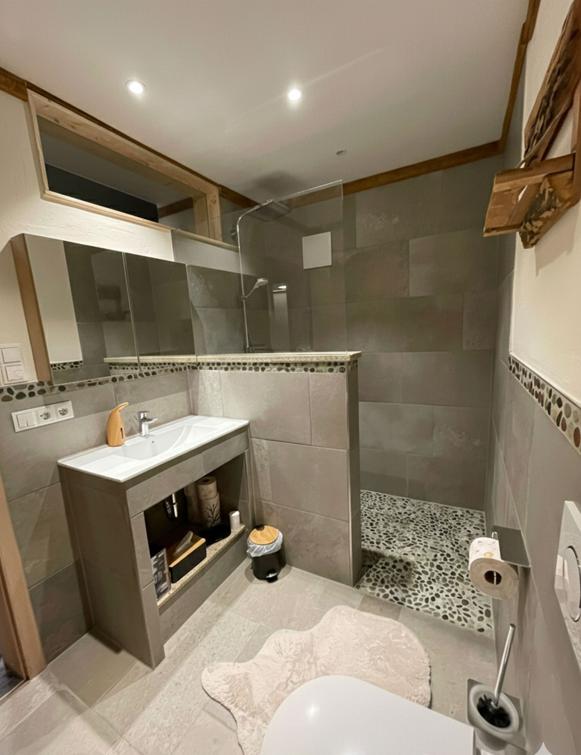 „Hinweis für Hundebesitzer: Damit sich Ihr Vierbeiner bei uns sofort wie zu Hause fühlt, bitten wir Sie, das eigene Hundekörbchen oder die vertraute Schlafdecke sowie Futternäpfe selbst mitzubringen. Die Erfahrung zeigt, dass die gewohnten Gerüche den Hunden helfen, sich in der neuen Umgebung schnell zu entspannen. Bitte achten Sie darauf, dass die Polstermöbel und Betten den zweibeinigen Gästen vorbehalten bleiben.“ „Natur pur direkt vor der Haustür: Unmittelbar neben unserem Haus fließt ein kleiner, idyllischer Bach. Er bietet an warmen Sommertagen die perfekte Erfrischung für Ihren Hund und sorgt mit seinem sanften Plätschern für eine herrlich entspannte Urlaubsatmosphäre auf Ihrem Balkon.“