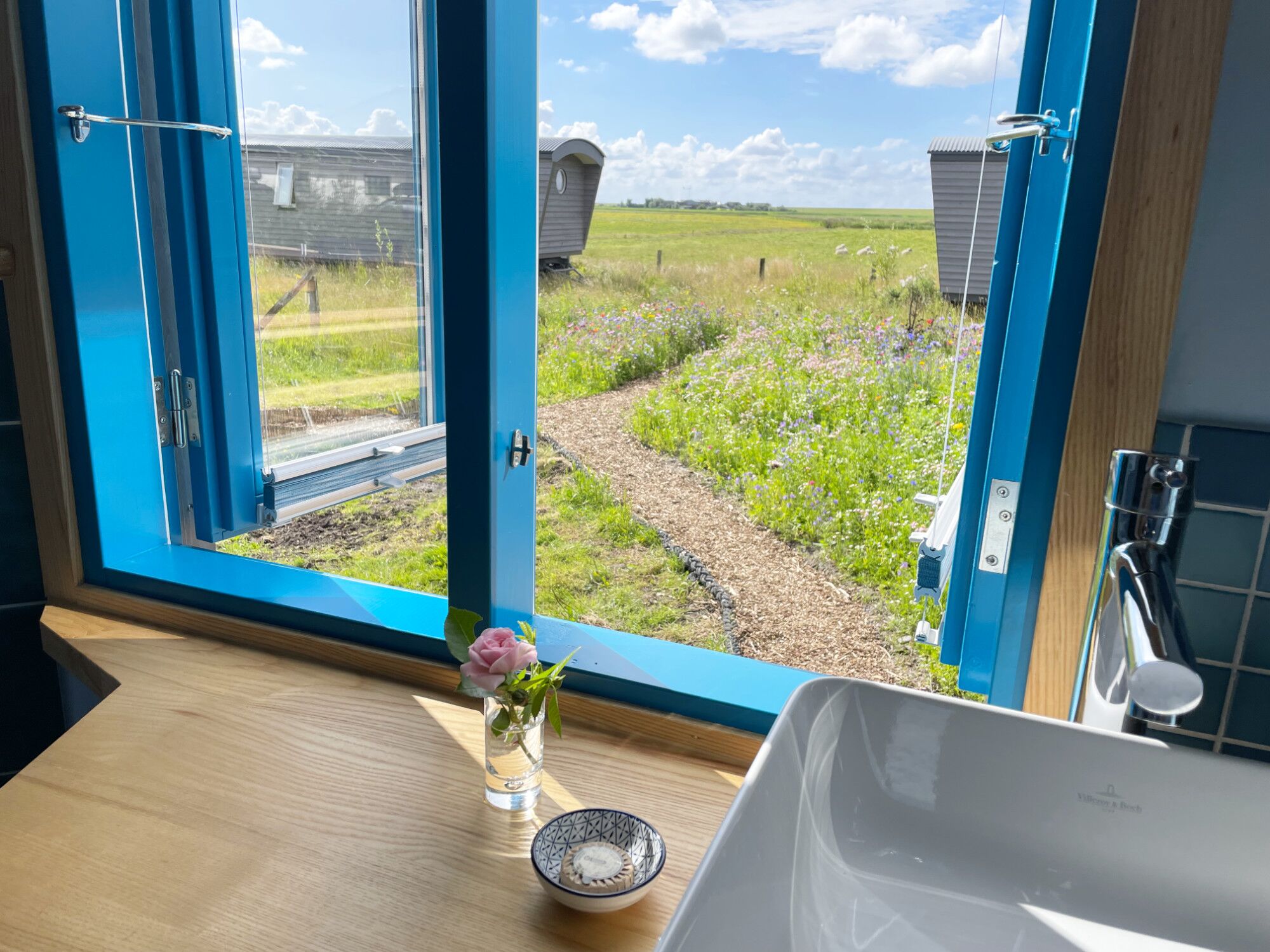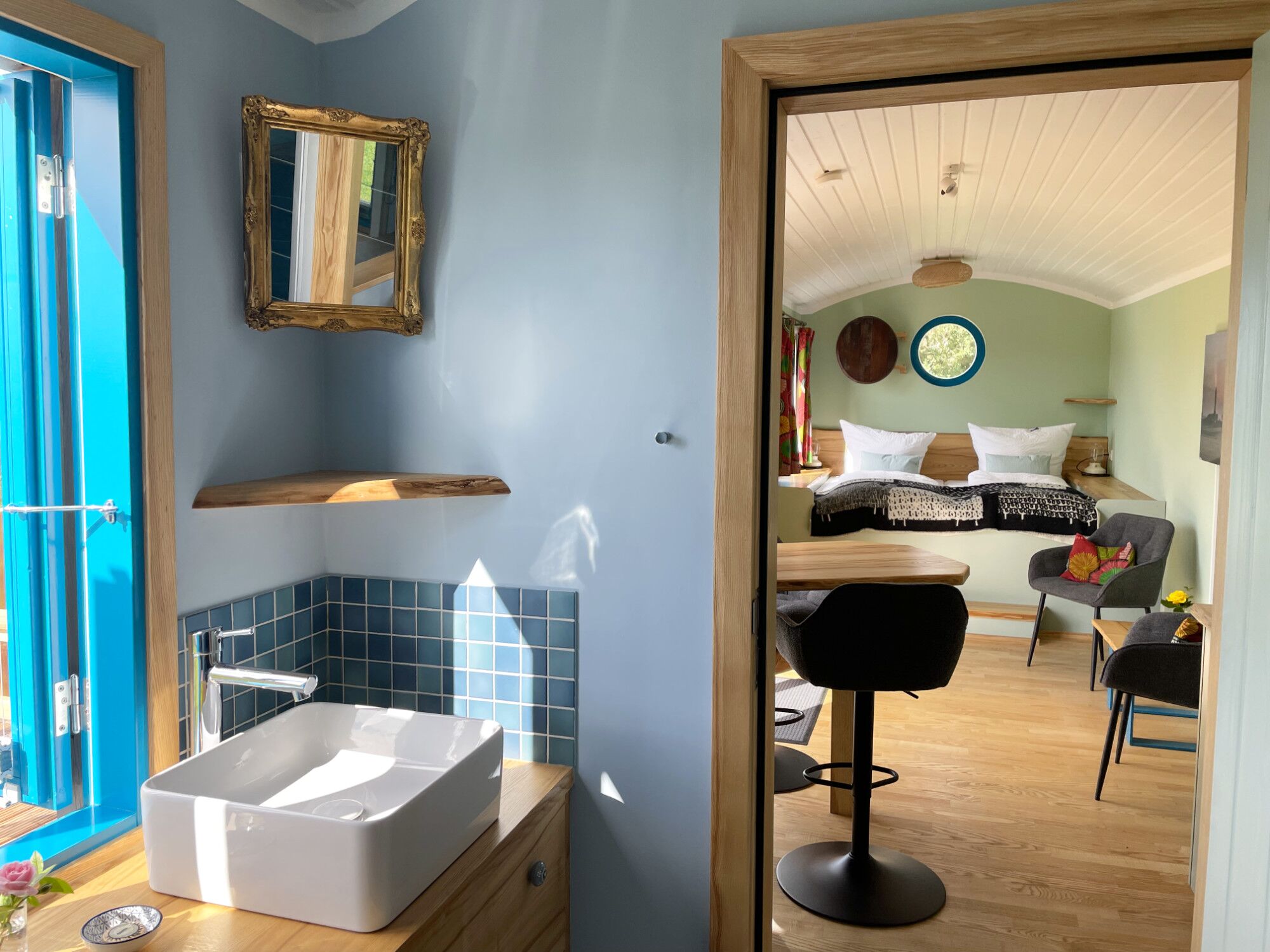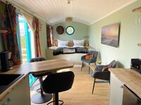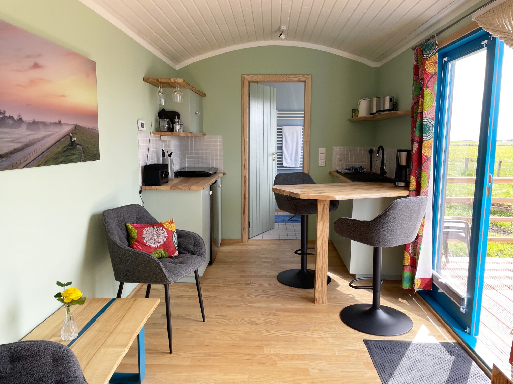 Genießen Sie einen unvergesslichen Urlaub in unserem neuen Tiny House "Schäferwagen Deichgraf". Es bietet auf 26m² alles, was Sie für einen komfortablen Urlaub benötigen: eine gemütliche Schlafkoje mit tollem Ausblick, ein voll ausgestattetes Dusch-Bad, eine kleine Pantry-Küche, einen gemütlichen Sitz- und Essbereich sowie eine großzügige Süd-Veranda vor dem Tiny House.
