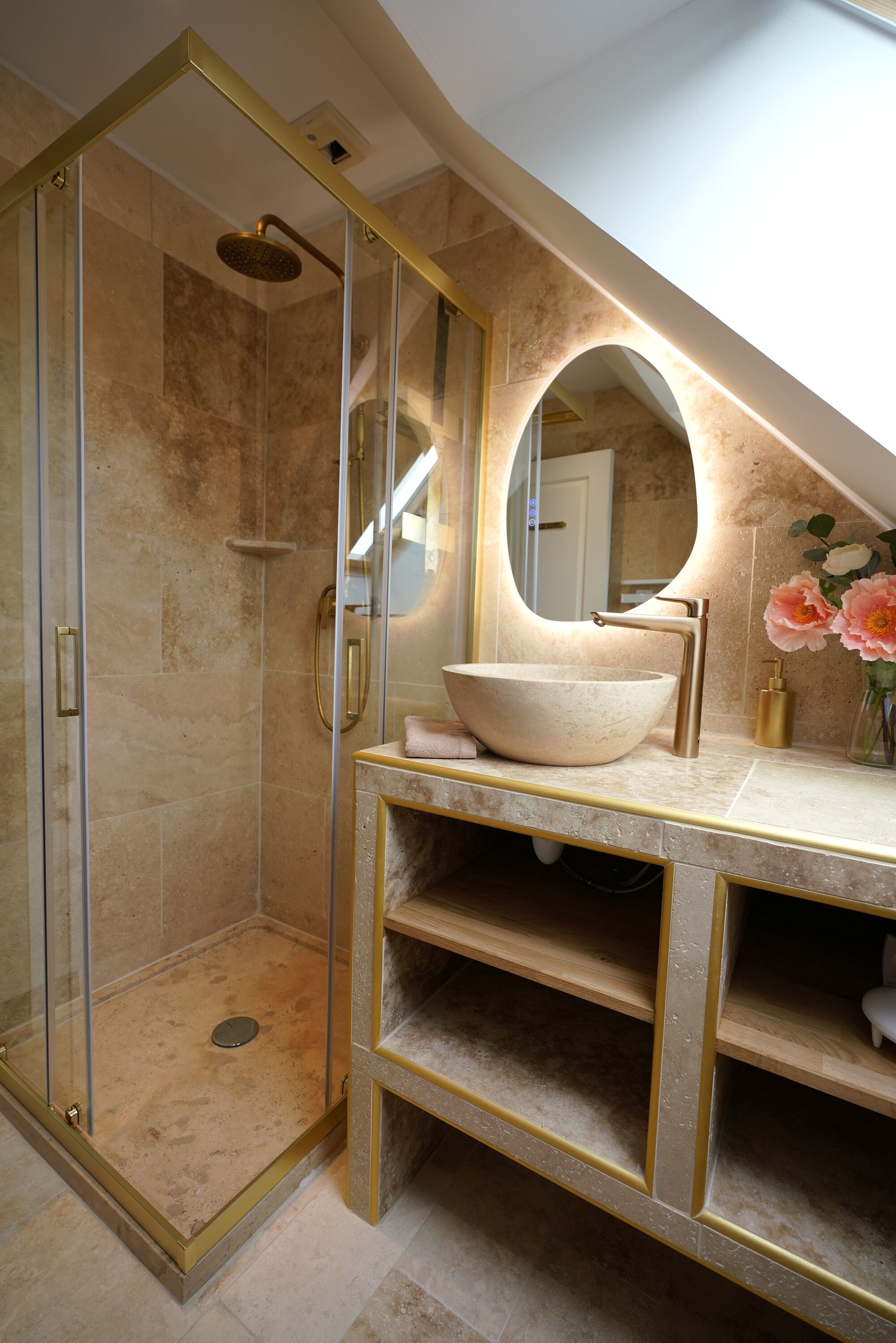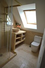 Elegantes kleines Travertinstein Duschbad im 1. Stock. Frottierwäsche kann im Wäschpaket gemietet werden.