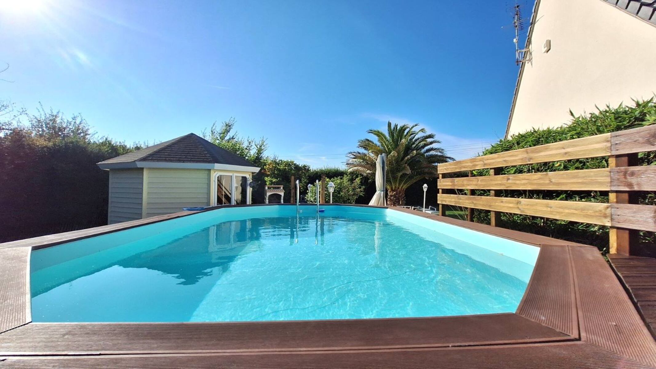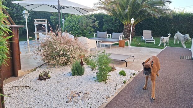 Der vollständig eingezäunte knapp 2000m² Garten sorgt für ungestörte Privatsphäre und Ihre Hunde können sich frei ums Haus bewegen, während Sie im Schatten der Palmen entspannen oder das sanfte Rauschen des Meeres hören. Nach langen Spaziergängen am Strand wartet hier Entspannung pur, an warmen Tagen sogar im Pool.