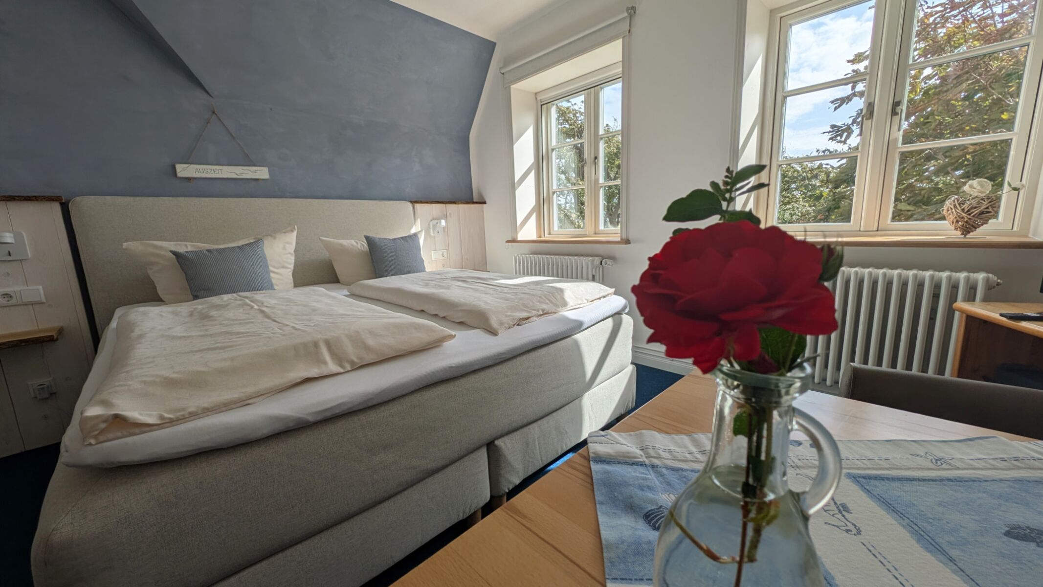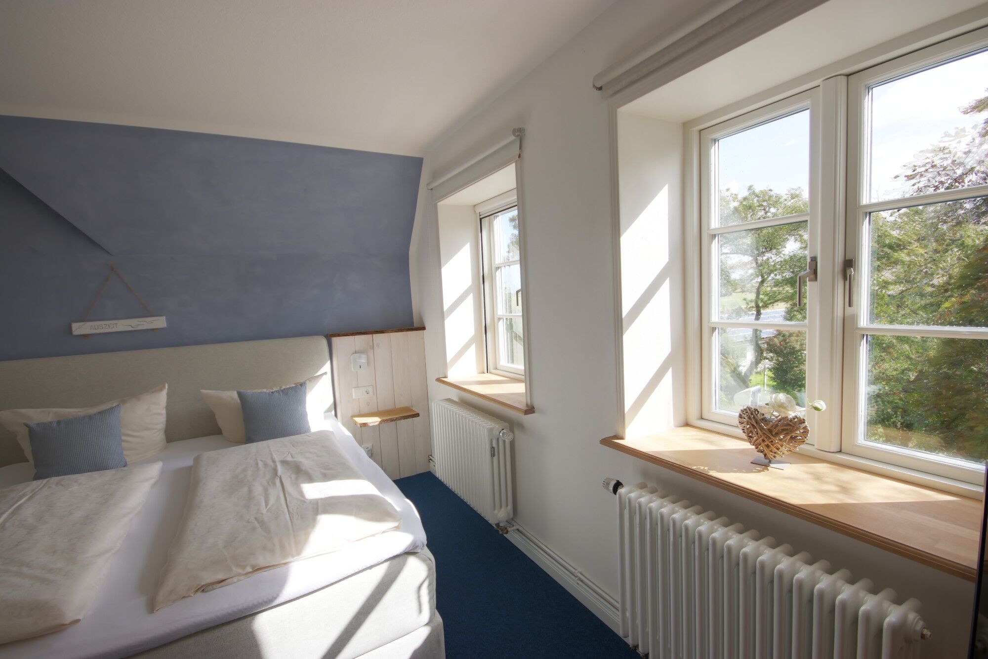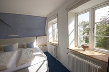 Genießen Sie erholsame Urlaubstage in unserem sonnigen Doppelzimmer Oland. Es hat zwei große Fenster Richtung Süden mit Ausblick in unseren idyllischen Bauerngarten. Auf Wunsch mit Frühstück buchbar. In unserem Garten finden Sie viele gemütliche Sitzgelegenheiten (Strandkörbe, Sonnenliegen,...). Die Nordsee, der Deich und der nächste Hundestrand sind nur 200 Meter entfernt.