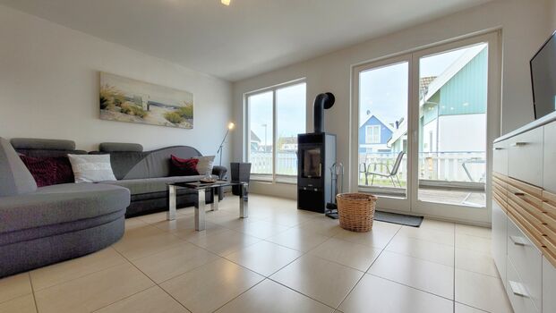 Die Doppelhaushälfte (3-Raum, EG+DG, ca. 80m²) mit eingezäunter Terrasse bietet ausreichend Platz für 6 Personen. Sie verfügt im Erdgeschoß über einen großen Wohn/Essbereich mit einer großen Schlafcouch, Kamin und Zugang zur Terrasse. Ein Tageslichtbad mit Dusche, WC und Infrarotsauna befindet sich ebenfalls im EG. Im Dachgeschoß befinden sich zwei separate Schlafzimmer für je 2 Personen sowie ein Tageslichtbad mit Badewanne, Whirlpool und WC.